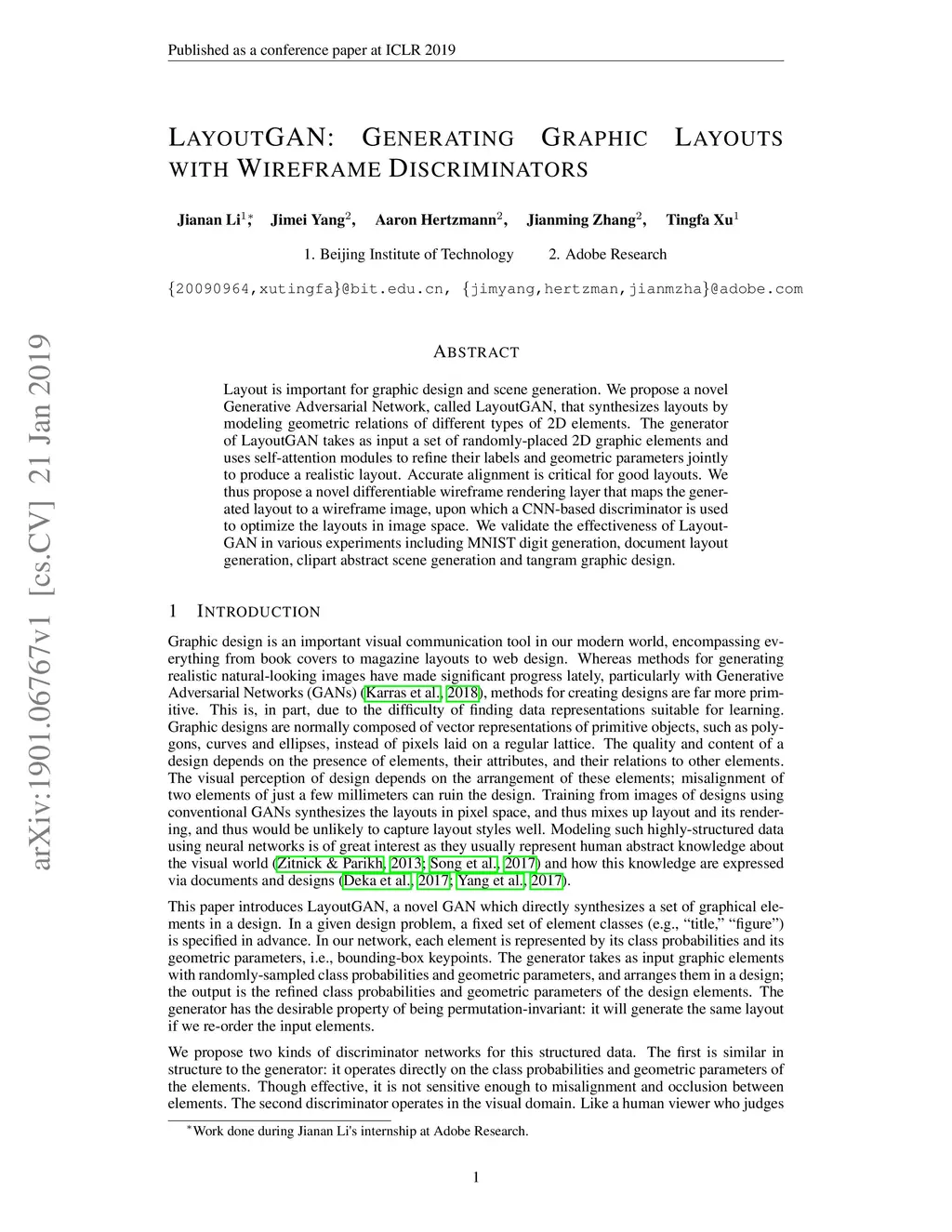 LayoutGAN: Generating Graphic Layouts with Wireframe Discriminators