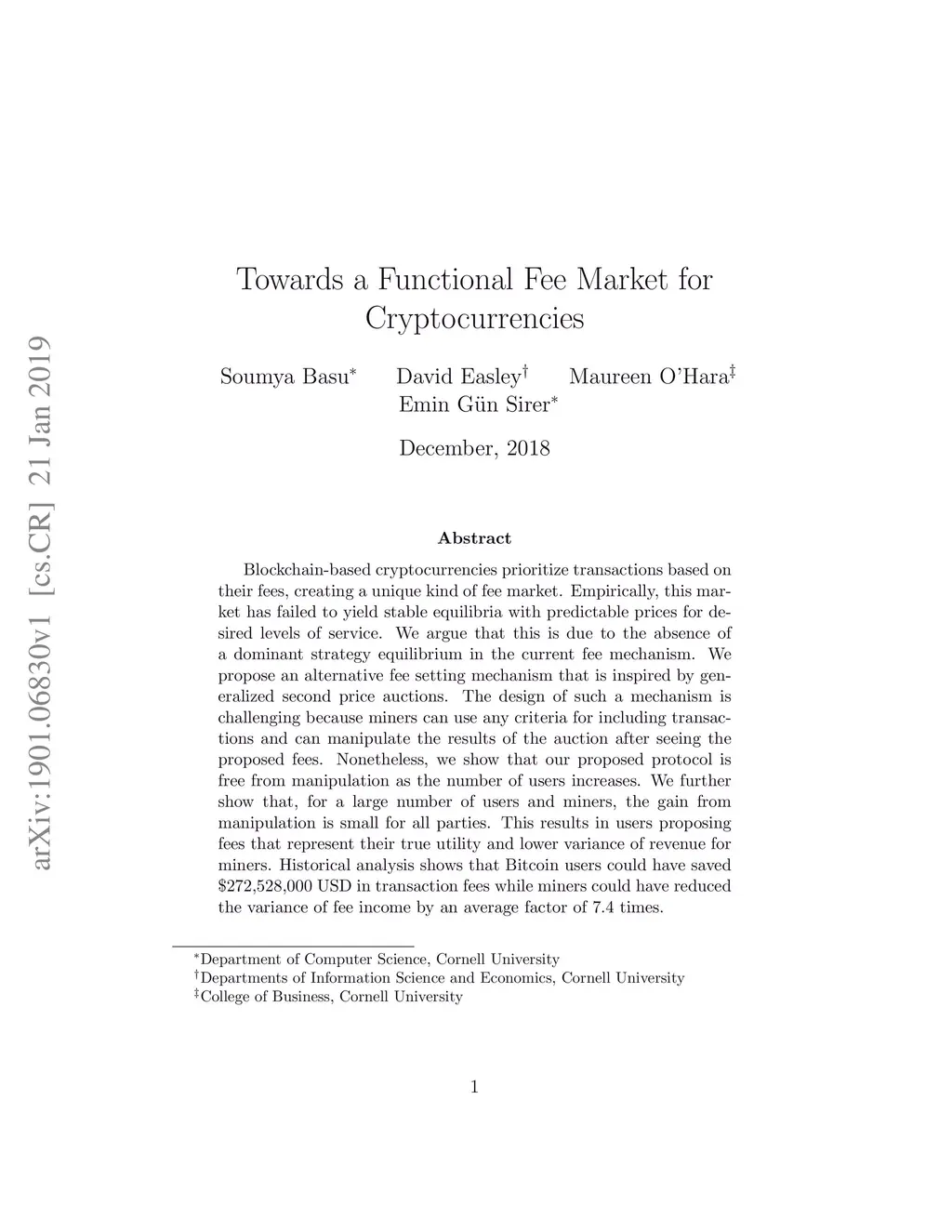 Blockchain-based cryptocurrencies prioritize transactions based on their fees, creating a unique kind of fee market. Empirically, this market has failed to yield stable equilibria with predictable prices for desired levels of service. We argue that this is due to the absence of a dominant strategy equilibrium in the current fee mechanism. We propose an alternative fee setting mechanism that is inspired by generalized second price auctions. The design of such a mechanism is challenging because miners can use any criteria for including transactions and can manipulate the results of the auction after seeing the proposed fees. Nonetheless, we show that our proposed protocol is free from manipulation as the number of users increases. We further show that, for a large number of users and miners, the gain from manipulation is small for all parties. This results in users proposing fees that represent their true utility and lower variance of revenue for miners. Historical analysis shows that Bitcoin users could have saved $272,528,000 USD in transaction fees while miners could have reduced the variance of fee income by an average factor of 7.4 times.