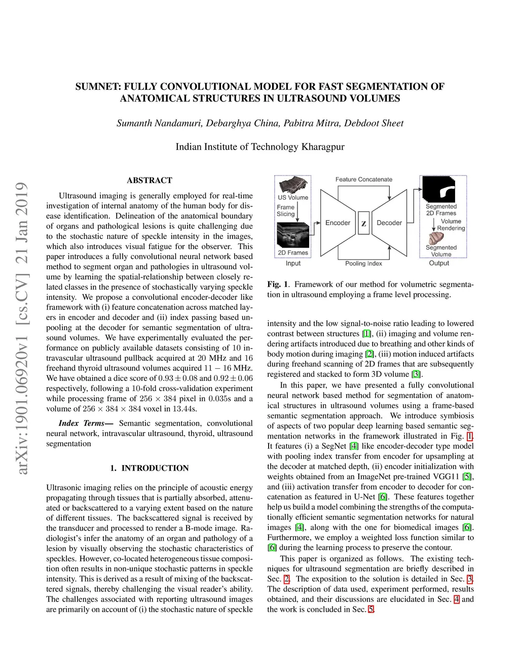 Ultrasound imaging is generally employed for real-time investigation of internal anatomy of the human body for disease identification. Delineation of the anatomical boundary of organs and pathological lesions is quite challenging due to the stochastic nature of speckle intensity in the images, which also introduces visual fatigue for the observer. This paper introduces a fully convolutional neural network based method to segment organ and pathologies in ultrasound volume by learning the spatial-relationship between closely related classes in the presence of stochastically varying speckle intensity. We propose a convolutional encoder-decoder like framework with (i) feature concatenation across matched layers in encoder and decoder and (ii) index passing based unpooling at the decoder for semantic segmentation of ultrasound volumes. We have experimentally evaluated the performance on publicly available datasets consisting of intravascular ultrasound pullback acquired at MHz and freehand thyroid ultrasound volumes acquired MHz. We have obtained a dice score of and respectively, following a -fold cross-validation experiment while processing frame of pixel in s and a volume of voxel in s.