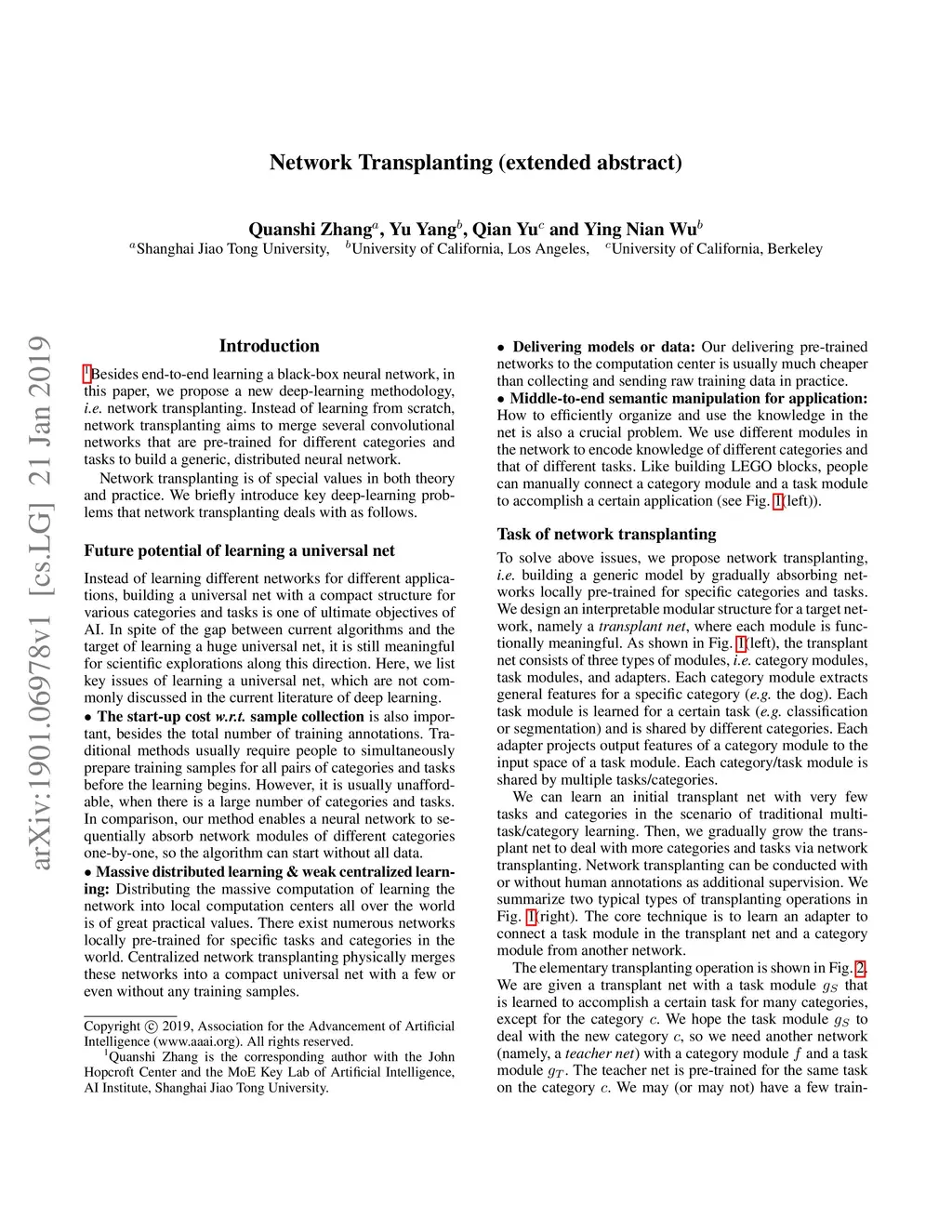 This paper focuses on a new task, i.e., transplanting a category-and-task-specific neural network to a generic, modular network without strong supervision. We design a functionally interpretable structure for the generic network. Like building LEGO blocks, we teach the generic network a new category by directly transplanting the module corresponding to the category from a pre-trained network with a few or even without sample annotations. Our method incrementally adds new categories to the generic network but does not affect representations of existing categories. In this way, our method breaks the typical bottleneck of learning a net for massive tasks and categories, i.e., the requirement of collecting samples for all tasks and categories at the same time before the learning begins. Thus, we use a new distillation algorithm, namely back-distillation, to overcome specific challenges of network transplanting. Our method without training samples even outperformed the baseline with 100 training samples.