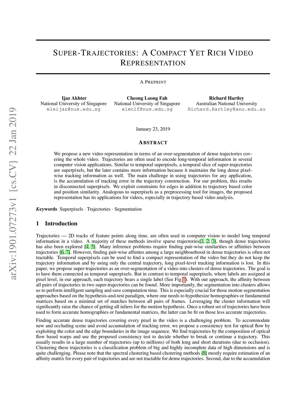 We propose a new video representation in terms of an over-segmentation of dense trajectories covering the whole video. Trajectories are often used to encode long-temporal information in several computer vision applications. Similar to temporal superpixels, a temporal slice of super-trajectories are superpixels, but the later contains more information because it maintains the long dense pixel-wise tracking information as well. The main challenge in using trajectories for any application, is the accumulation of tracking error in the trajectory construction. For our problem, this results in disconnected superpixels. We exploit constraints for edges in addition to trajectory based color and position similarity. Analogous to superpixels as a preprocessing tool for images, the proposed representation has its applications for videos, especially in trajectory based video analysis.