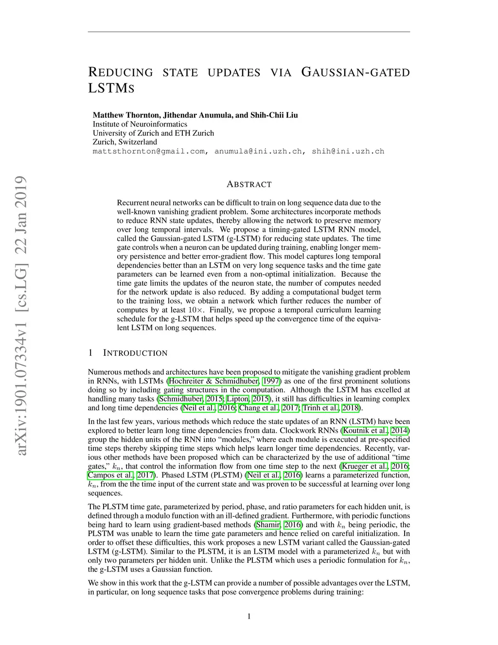 Recurrent neural networks can be difficult to train on long sequence data due to the well-known vanishing gradient problem. Some architectures incorporate methods to reduce RNN state updates, therefore allowing the network to preserve memory over long temporal intervals. To address these problems of convergence, this paper proposes a timing-gated LSTM RNN model, called the Gaussian-gated LSTM (g-LSTM). The time gate controls when a neuron can be updated during training, enabling longer memory persistence and better error-gradient flow. This model captures long-temporal dependencies better than an LSTM and the time gate parameters can be learned even from non-optimal initialization values. Because the time gate limits the updates of the neuron state, the number of computes needed for the network update is also reduced. By adding a computational budget term to the training loss, we can obtain a network which further reduces the number of computes by at least 10x. Finally, by employing a temporal curriculum learning schedule for the g-LSTM, we can reduce the convergence time of the equivalent LSTM network on long sequences.