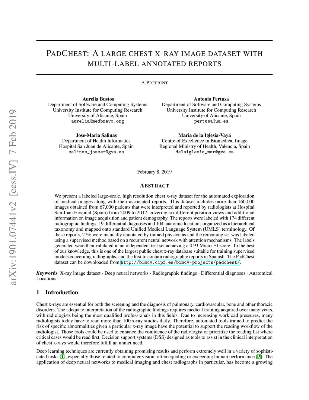 We present a labeled large-scale, high resolution chest x-ray dataset for the automated exploration of medical images along with their associated reports. This dataset includes more than 160,000 images obtained from 67,000 patients that were interpreted and reported by radiologists at Hospital San Juan Hospital (Spain) from 2009 to 2017, covering six different position views and additional information on image acquisition and patient demography. The reports were labeled with 174 different radiographic findings, 19 differential diagnoses and 104 anatomic locations organized as a hierarchical taxonomy and mapped onto standard Unified Medical Language System (UMLS) terminology. Of these reports, 27% were manually annotated by trained physicians and the remaining set was labeled using a supervised method based on a recurrent neural network with attention mechanisms. The labels generated were then validated in an independent test set achieving a 0.93 Micro-F1 score. To the best of our knowledge, this is one of the largest public chest x-ray database suitable for training supervised models concerning radiographs, and the first to contain radiographic reports in Spanish. The PadChest dataset can be downloaded from http://bimcv.cipf.es/bimcv-projects/padchest/.