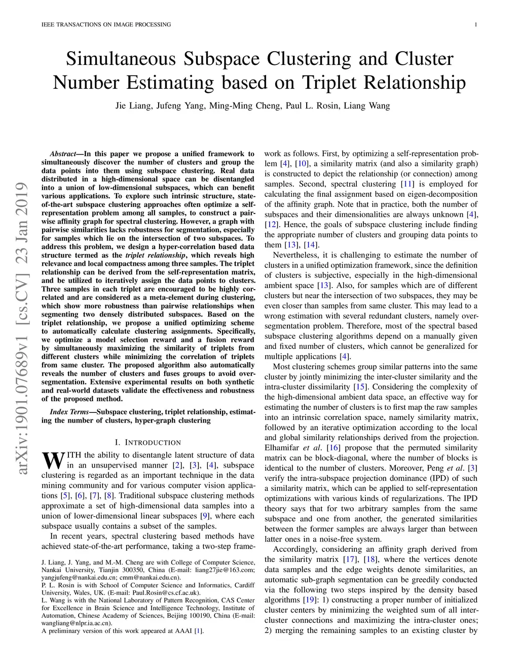 In this paper we propose a unified framework to simultaneously discover the number of clusters and group the data points into them using subspace clustering. Real data distributed in a high-dimensional space can be disentangled into a union of low-dimensional subspaces, which can benefit various applications. To explore such intrinsic structure, state-of-the-art subspace clustering approaches often optimize a self-representation problem among all samples, to construct a pairwise affinity graph for spectral clustering. However, a graph with pairwise similarities lacks robustness for segmentation, especially for samples which lie on the intersection of two subspaces. To address this problem, we design a hyper-correlation based data structure termed as the \textit{triplet relationship}, which reveals high relevance and local compactness among three samples. The triplet relationship can be derived from the self-representation matrix, and be utilized to iteratively assign the data points to clusters. Three samples in each triplet are encouraged to be highly correlated and are considered as a meta-element during clustering, which show more robustness than pairwise relationships when segmenting two densely distributed subspaces. Based on the triplet relationship, we propose a unified optimizing scheme to automatically calculate clustering assignments. Specifically, we optimize a model selection reward and a fusion reward by simultaneously maximizing the similarity of triplets from different clusters while minimizing the correlation of triplets from same cluster. The proposed algorithm also automatically reveals the number of clusters and fuses groups to avoid over-segmentation. Extensive experimental results on both synthetic and real-world datasets validate the effectiveness and robustness of the proposed method.