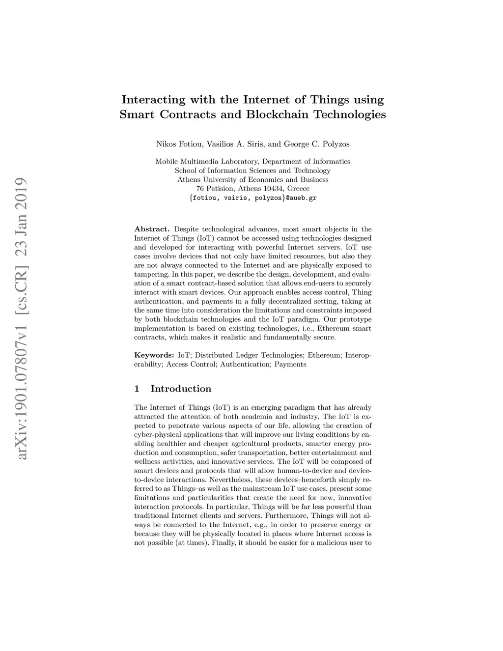 Despite technological advances, most smart objects in the Internet of Things (IoT) cannot be accessed using technologies designed and developed for interacting with powerful Internet servers. IoT use cases involve devices that not only have limited resources, but also they are not always connected to the Internet and are physically exposed to tampering. In this paper, we describe the design, development, and evaluation of a smart contract-based solution that allows end-users to securely interact with smart devices. Our approach enables access control, Thing authentication, and payments in a fully decentralized setting, taking at the same time into consideration the limitations and constraints imposed by both blockchain technologies and the IoT paradigm. Our prototype implementation is based on existing technologies, i.e., Ethereum smart contracts, which makes it realistic and fundamentally secure.
