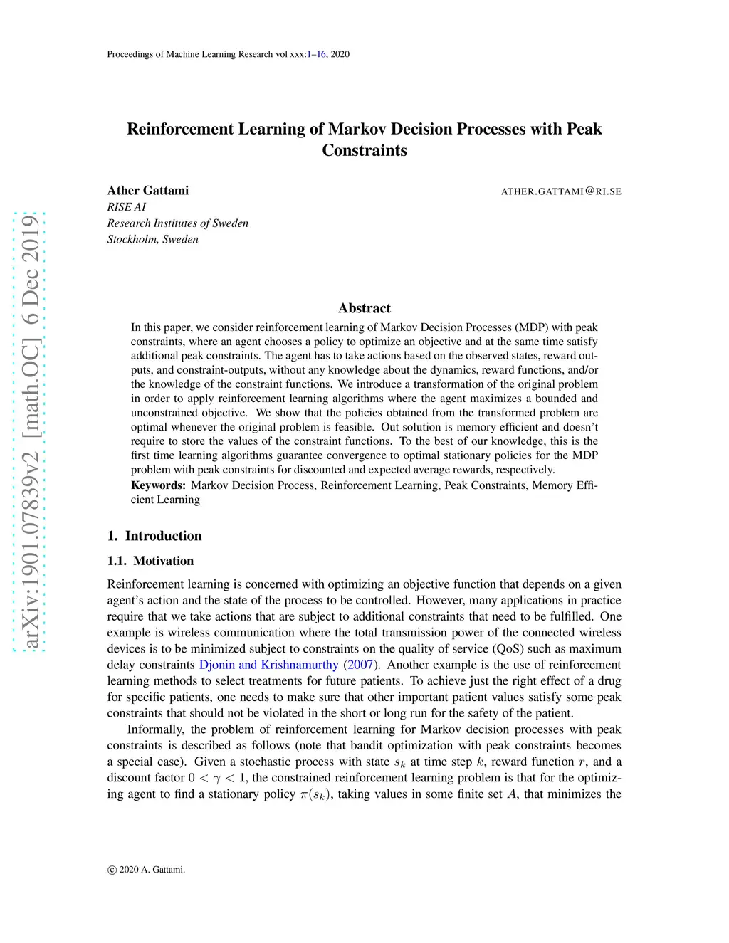 Reinforcement Learning of Markov Decision Processes with Peak