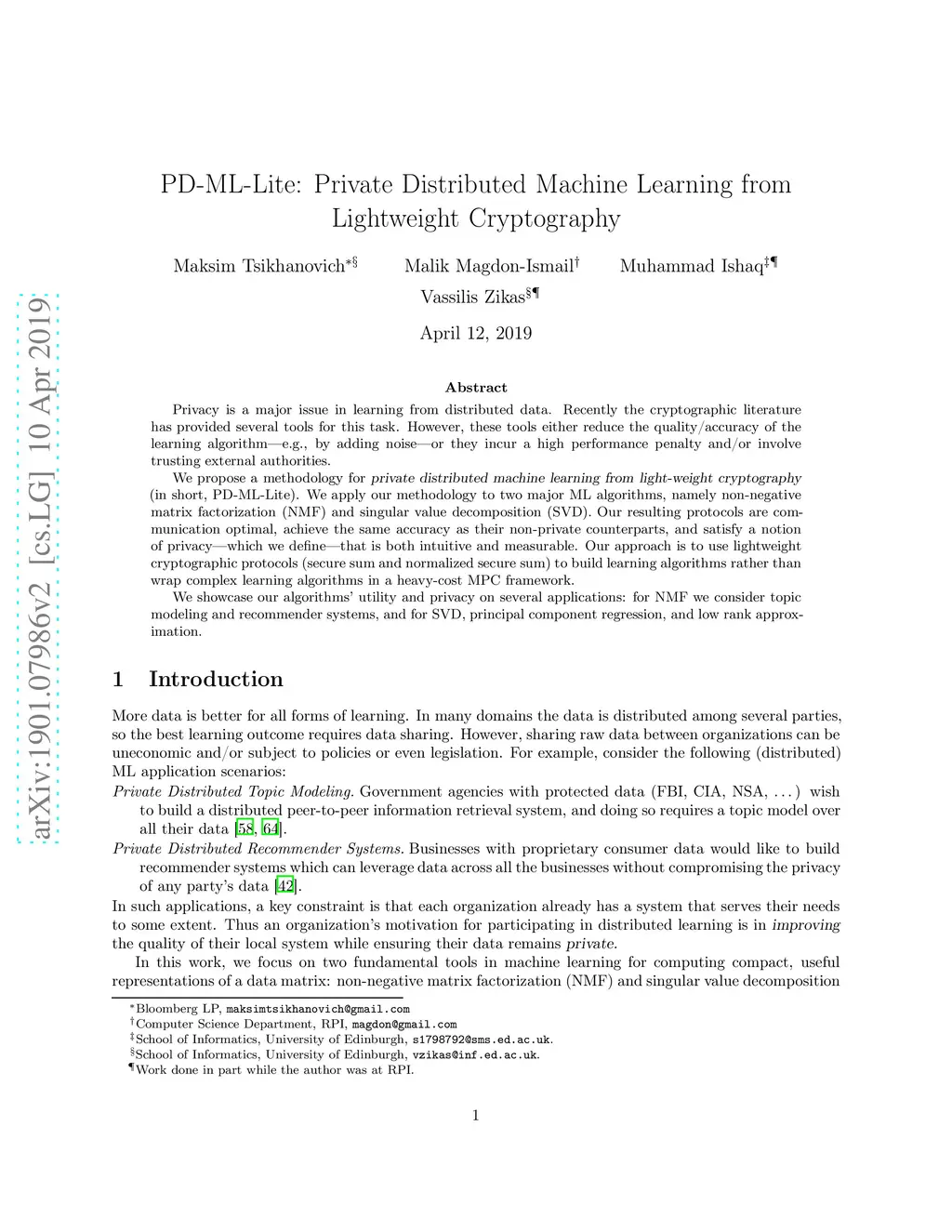 Privacy is a major issue in learning from distributed data. Recently the cryptographic literature has provided several tools for this task. However, these tools either reduce the quality/accuracy of the learning algorithm---e.g., by adding noise---or they incur a high performance penalty and/or involve trusting external authorities. We propose a methodology for {\sl private distributed machine learning from light-weight cryptography} (in short, PD-ML-Lite). We apply our methodology to two major ML algorithms, namely non-negative matrix factorization (NMF) and singular value decomposition (SVD). Our resulting protocols are communication optimal, achieve the same accuracy as their non-private counterparts, and satisfy a notion of privacy---which we define---that is both intuitive and measurable. Our approach is to use lightweight cryptographic protocols (secure sum and normalized secure sum) to build learning algorithms rather than wrap complex learning algorithms in a heavy-cost MPC framework. We showcase our algorithms' utility and privacy on several applications: for NMF we consider topic modeling and recommender systems, and for SVD, principal component regression, and low rank approximation.