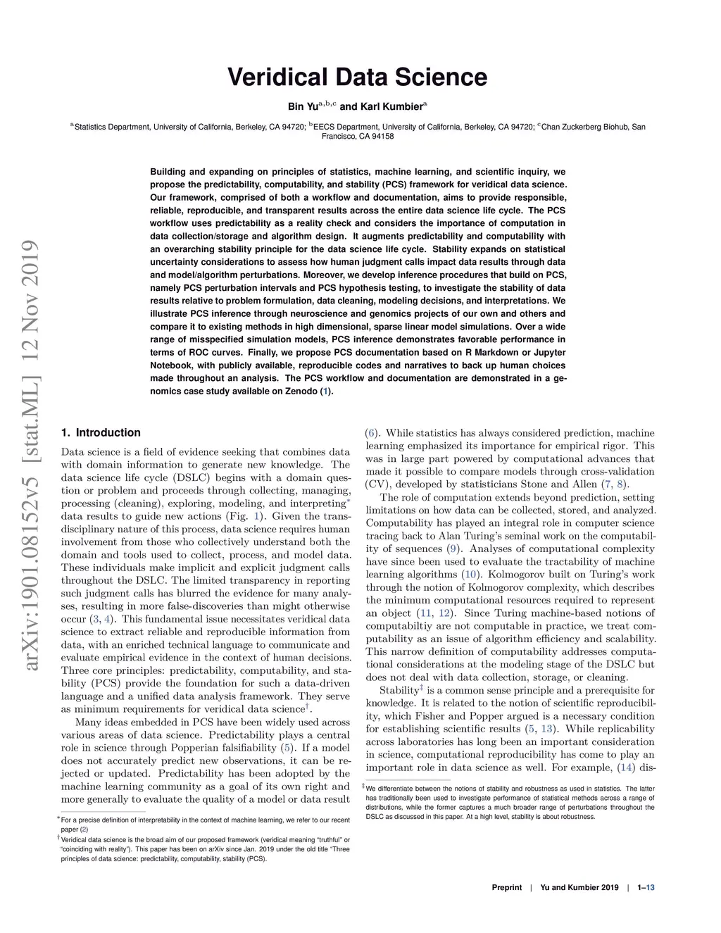 Building and expanding on principles of statistics, machine learning, and scientific inquiry, we propose the predictability, computability, and stability (PCS) framework for veridical data science. Our framework, comprised of both a workflow and documentation, aims to provide responsible, reliable, reproducible, and transparent results across the entire data science life cycle. The PCS workflow uses predictability as a reality check and considers the importance of computation in data collection/storage and algorithm design. It augments predictability and computability with an overarching stability principle for the data science life cycle. Stability expands on statistical uncertainty considerations to assess how human judgment calls impact data results through data and model/algorithm perturbations. Moreover, we develop inference procedures that build on PCS, namely PCS perturbation intervals and PCS hypothesis testing, to investigate the stability of data results relative to problem formulation, data cleaning, modeling decisions, and interpretations. We illustrate PCS inference through neuroscience and genomics projects of our own and others and compare it to existing methods in high dimensional, sparse linear model simulations. Over a wide range of misspecified simulation models, PCS inference demonstrates favorable performance in terms of ROC curves. Finally, we propose PCS documentation based on R Markdown or Jupyter Notebook, with publicly available, reproducible codes and narratives to back up human choices made throughout an analysis. The PCS workflow and documentation are demonstrated in a genomics case study available on Zenodo.