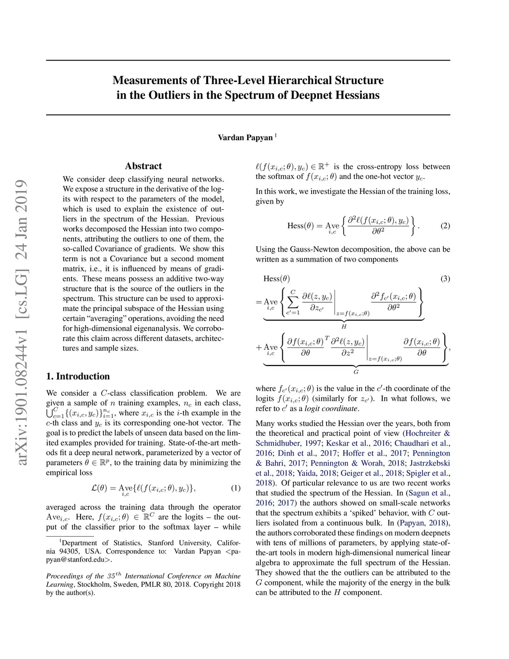 We consider deep classifying neural networks. We expose a structure in the derivative of the logits with respect to the parameters of the model, which is used to explain the existence of outliers in the spectrum of the Hessian. Previous works decomposed the Hessian into two components, attributing the outliers to one of them, the so-called Covariance of gradients. We show this term is not a Covariance but a second moment matrix, i.e., it is influenced by means of gradients. These means possess an additive two-way structure that is the source of the outliers in the spectrum. This structure can be used to approximate the principal subspace of the Hessian using certain "averaging" operations, avoiding the need for high-dimensional eigenanalysis. We corroborate this claim across different datasets, architectures and sample sizes.