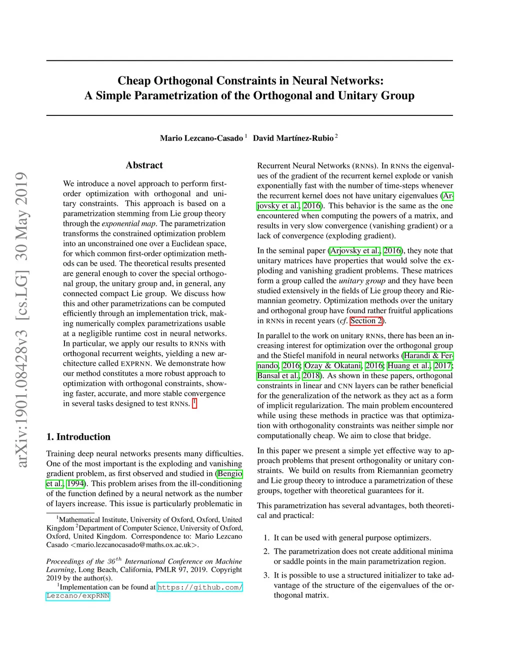 We introduce a novel approach to perform first-order optimization with orthogonal and unitary constraints. This approach is based on a parametrization stemming from Lie group theory through the exponential map. The parametrization transforms the constrained optimization problem into an unconstrained one over a Euclidean space, for which common first-order optimization methods can be used. The theoretical results presented are general enough to cover the special orthogonal group, the unitary group and, in general, any connected compact Lie group. We discuss how this and other parametrizations can be computed efficiently through an implementation trick, making numerically complex parametrizations usable at a negligible runtime cost in neural networks. In particular, we apply our results to RNNs with orthogonal recurrent weights, yielding a new architecture called expRNN. We demonstrate how our method constitutes a more robust approach to optimization with orthogonal constraints, showing faster, accurate, and more stable convergence in several tasks designed to test RNNs.