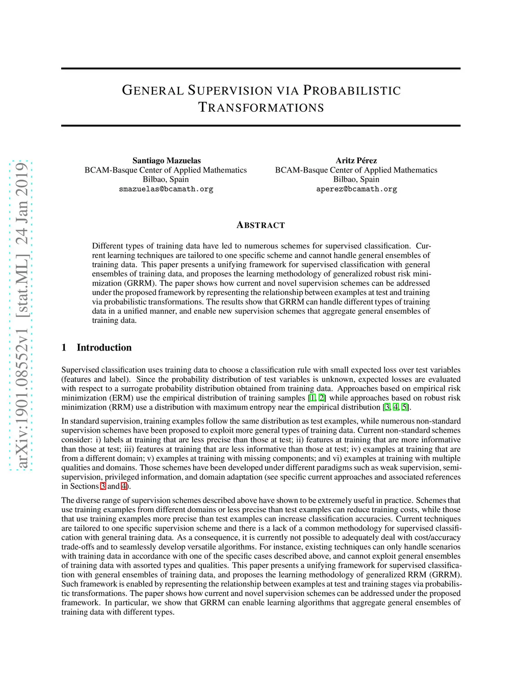 Different types of training data have led to numerous schemes for supervised classification. Current learning techniques are tailored to one specific scheme and cannot handle general ensembles of training data. This paper presents a unifying framework for supervised classification with general ensembles of training data, and proposes the learning methodology of generalized robust risk minimization (GRRM). The paper shows how current and novel supervision schemes can be addressed under the proposed framework by representing the relationship between examples at test and training via probabilistic transformations. The results show that GRRM can handle different types of training data in a unified manner, and enable new supervision schemes that aggregate general ensembles of training data.