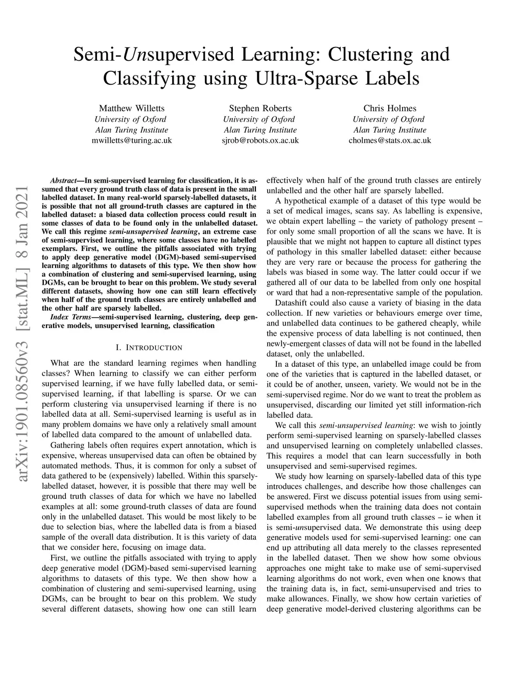 In semi-supervised learning for classification, it is assumed that every ground truth class of data is present in the small labelled dataset. Many real-world sparsely-labelled datasets are plausibly not of this type. It could easily be the case that some classes of data are found only in the unlabelled dataset -- perhaps the labelling process was biased -- so we do not have any labelled examples to train on for some classes. We call this learning regime , an extreme case of semi-supervised learning, where some classes have no labelled exemplars in the training set. First, we outline the pitfalls associated with trying to apply deep generative model (DGM)-based semi-supervised learning algorithms to datasets of this type. We then show how a combination of clustering and semi-supervised learning, using DGMs, can be brought to bear on this problem. We study several different datasets, showing how one can still learn effectively when half of the ground truth classes are entirely unlabelled and the other half are sparsely labelled.