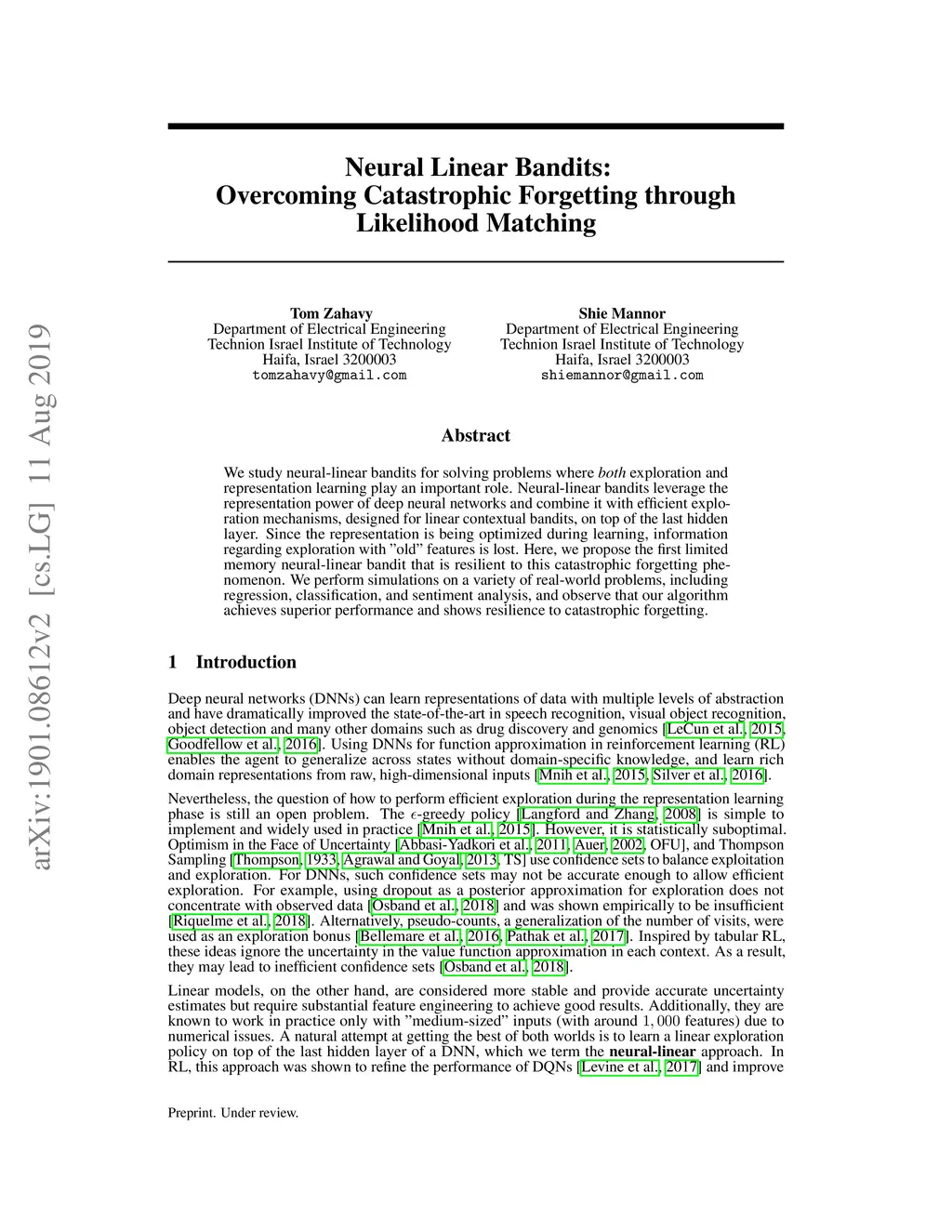 We study the neural-linear bandit model for solving sequential decision-making problems with high dimensional side information. Neural-linear bandits leverage the representation power of deep neural networks and combine it with efficient exploration mechanisms, designed for linear contextual bandits, on top of the last hidden layer. Since the representation is being optimized during learning, information regarding exploration with "old" features is lost. Here, we propose the first limited memory neural-linear bandit that is resilient to this phenomenon, which we term catastrophic forgetting. We evaluate our method on a variety of real-world data sets, including regression, classification, and sentiment analysis, and observe that our algorithm is resilient to catastrophic forgetting and achieves superior performance.