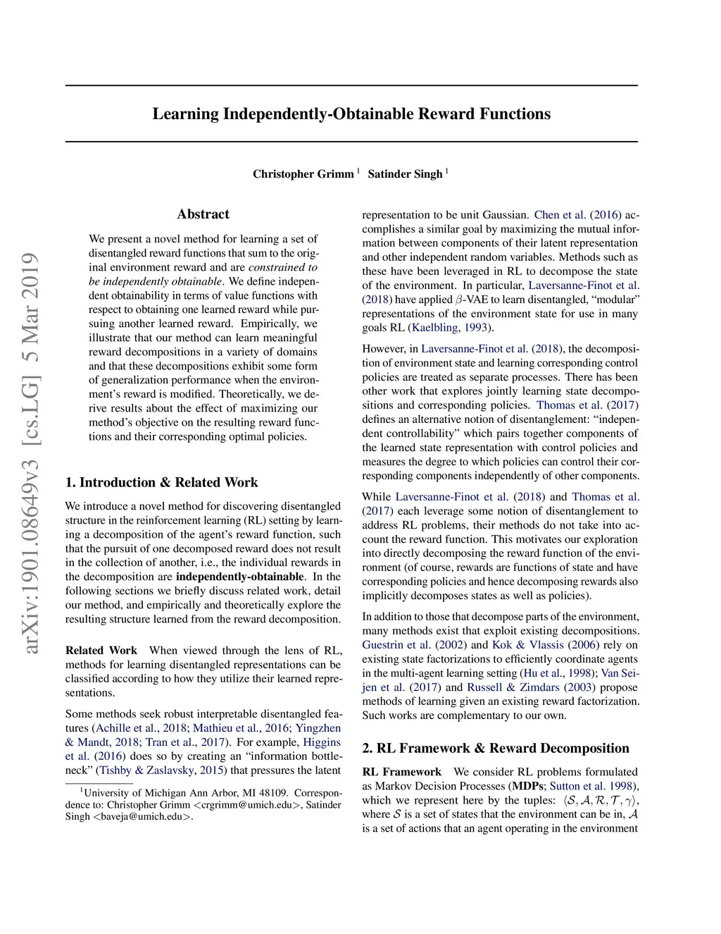 We present a novel method for learning a set of disentangled reward functions that sum to the original environment reward and are constrained to be independently obtainable. We define independent obtainability in terms of value functions with respect to obtaining one learned reward while pursuing another learned reward. Empirically, we illustrate that our method can learn meaningful reward decompositions in a variety of domains and that these decompositions exhibit some form of generalization performance when the environment's reward is modified. Theoretically, we derive results about the effect of maximizing our method's objective on the resulting reward functions and their corresponding optimal policies.