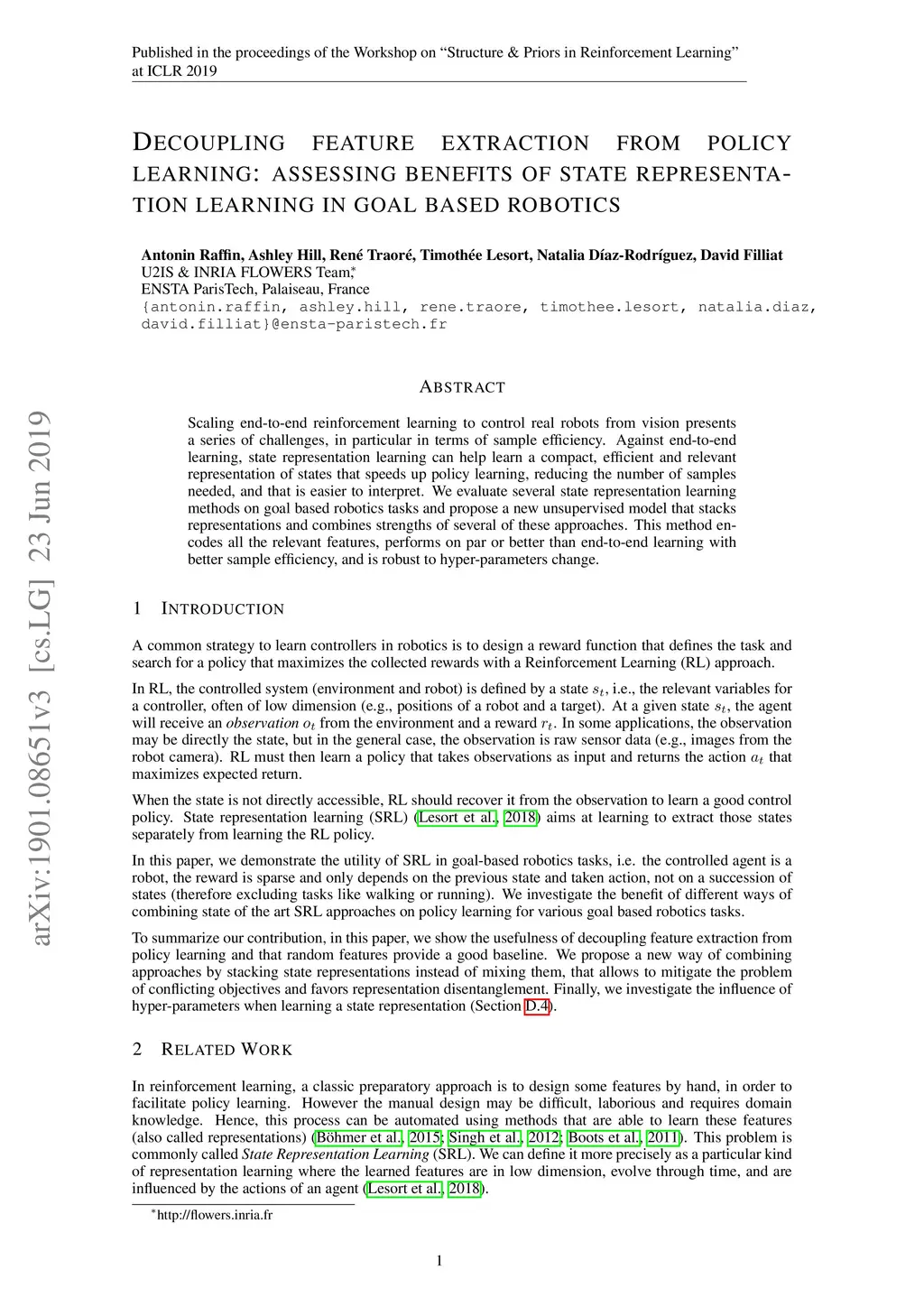 Scaling end-to-end reinforcement learning to control real robots from vision presents a series of challenges, in particular in terms of sample efficiency. Against end-to-end learning, state representation learning can help learn a compact, efficient and relevant representation of states that speeds up policy learning, reducing the number of samples needed, and that is easier to interpret. We evaluate several state representation learning methods on goal based robotics tasks and propose a new unsupervised model that stacks representations and combines strengths of several of these approaches. This method encodes all the relevant features, performs on par or better than end-to-end learning, and is robust to hyper-parameters change.