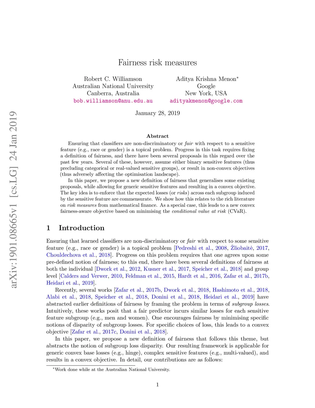 Ensuring that classifiers are non-discriminatory or fair with respect to a sensitive feature (e.g., race or gender) is a topical problem. Progress in this task requires fixing a definition of fairness, and there have been several proposals in this regard over the past few years. Several of these, however, assume either binary sensitive features (thus precluding categorical or real-valued sensitive groups), or result in non-convex objectives (thus adversely affecting the optimisation landscape). In this paper, we propose a new definition of fairness that generalises some existing proposals, while allowing for generic sensitive features and resulting in a convex objective. The key idea is to enforce that the expected losses (or risks) across each subgroup induced by the sensitive feature are commensurate. We show how this relates to the rich literature on risk measures from mathematical finance. As a special case, this leads to a new convex fairness-aware objective based on minimising the conditional value at risk (CVaR).
