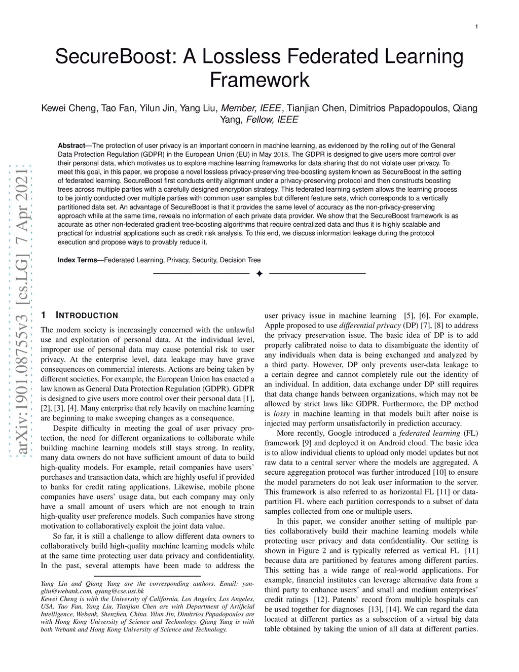 The protection of user privacy is an important concern in machine learning, as evidenced by the rolling out of the General Data Protection Regulation (GDPR) in the European Union (EU) in May 2018. The GDPR is designed to give users more control over their personal data, which motivates us to explore machine learning frameworks for data sharing that do not violate user privacy. To meet this goal, in this paper, we propose a novel lossless privacy-preserving tree-boosting system known as SecureBoost in the setting of federated learning. SecureBoost first conducts entity alignment under a privacy-preserving protocol and then constructs boosting trees across multiple parties with a carefully designed encryption strategy. This federated learning system allows the learning process to be jointly conducted over multiple parties with common user samples but different feature sets, which corresponds to a vertically partitioned data set. An advantage of SecureBoost is that it provides the same level of accuracy as the non-privacy-preserving approach while at the same time, reveals no information of each private data provider. We show that the SecureBoost framework is as accurate as other non-federated gradient tree-boosting algorithms that require centralized data and thus it is highly scalable and practical for industrial applications such as credit risk analysis. To this end, we discuss information leakage during the protocol execution and propose ways to provably reduce it.