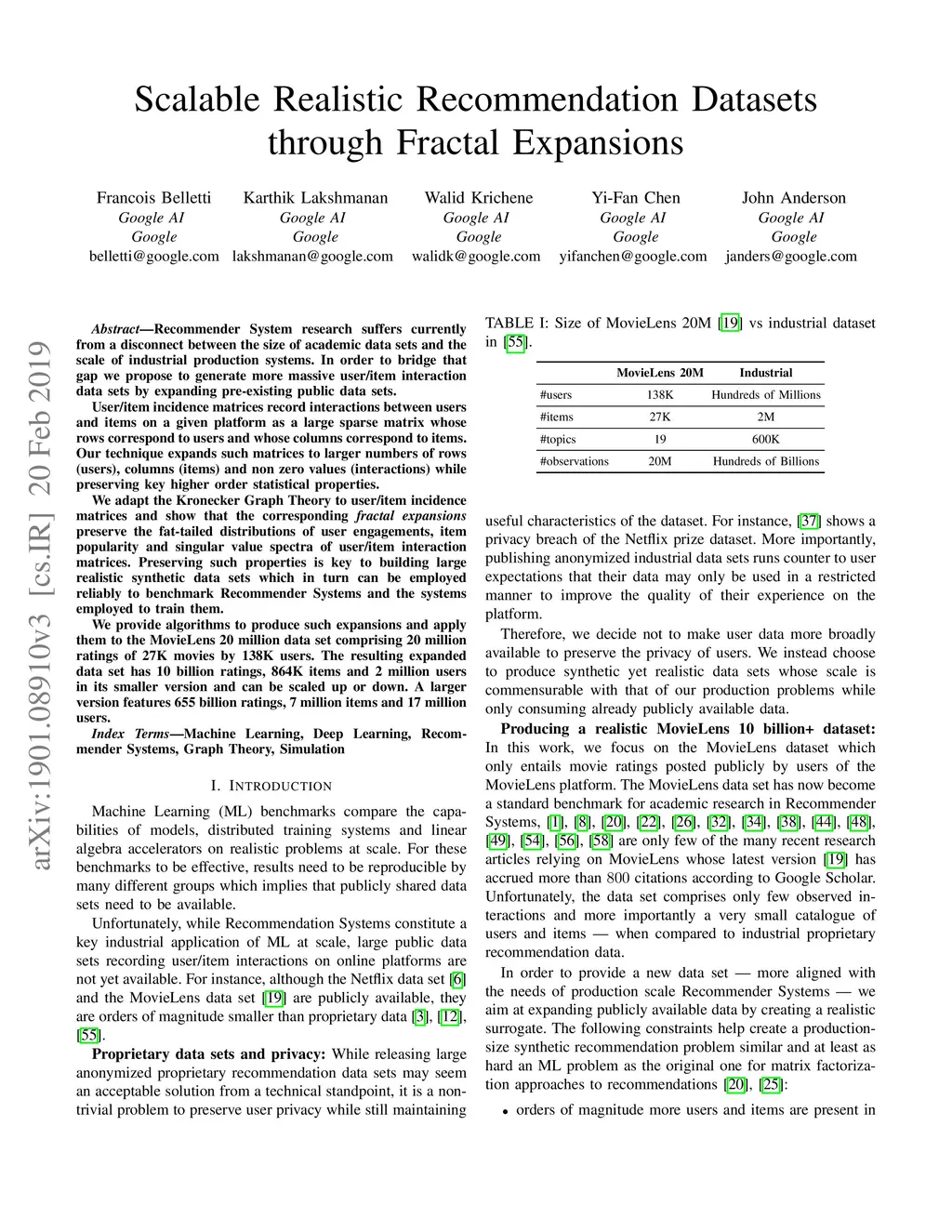 Recommender System research suffers currently from a disconnect between the size of academic data sets and the scale of industrial production systems. In order to bridge that gap we propose to generate more massive user/item interaction data sets by expanding pre-existing public data sets. User/item incidence matrices record interactions between users and items on a given platform as a large sparse matrix whose rows correspond to users and whose columns correspond to items. Our technique expands such matrices to larger numbers of rows (users), columns (items) and non zero values (interactions) while preserving key higher order statistical properties. We adapt the Kronecker Graph Theory to user/item incidence matrices and show that the corresponding fractal expansions preserve the fat-tailed distributions of user engagements, item popularity and singular value spectra of user/item interaction matrices. Preserving such properties is key to building large realistic synthetic data sets which in turn can be employed reliably to benchmark Recommender Systems and the systems employed to train them. We provide algorithms to produce such expansions and apply them to the MovieLens 20 million data set comprising 20 million ratings of 27K movies by 138K users. The resulting expanded data set has 10 billion ratings, 864K items and 2 million users in its smaller version and can be scaled up or down. A larger version features 655 billion ratings, 7 million items and 17 million users.