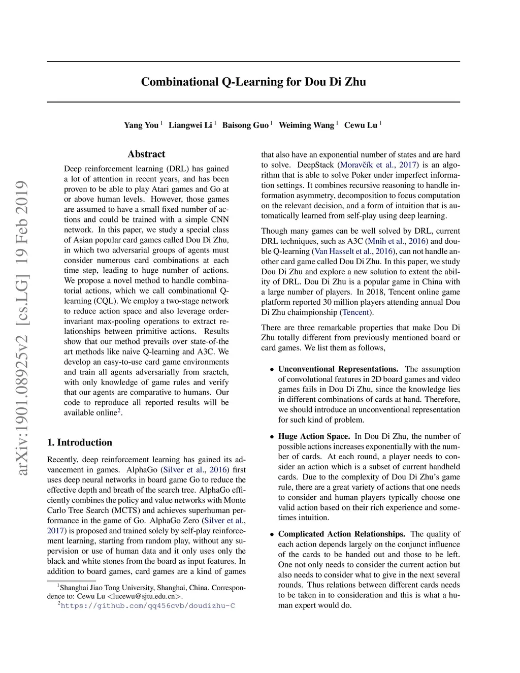 Combinational Q-Learning for Dou Di Zhu