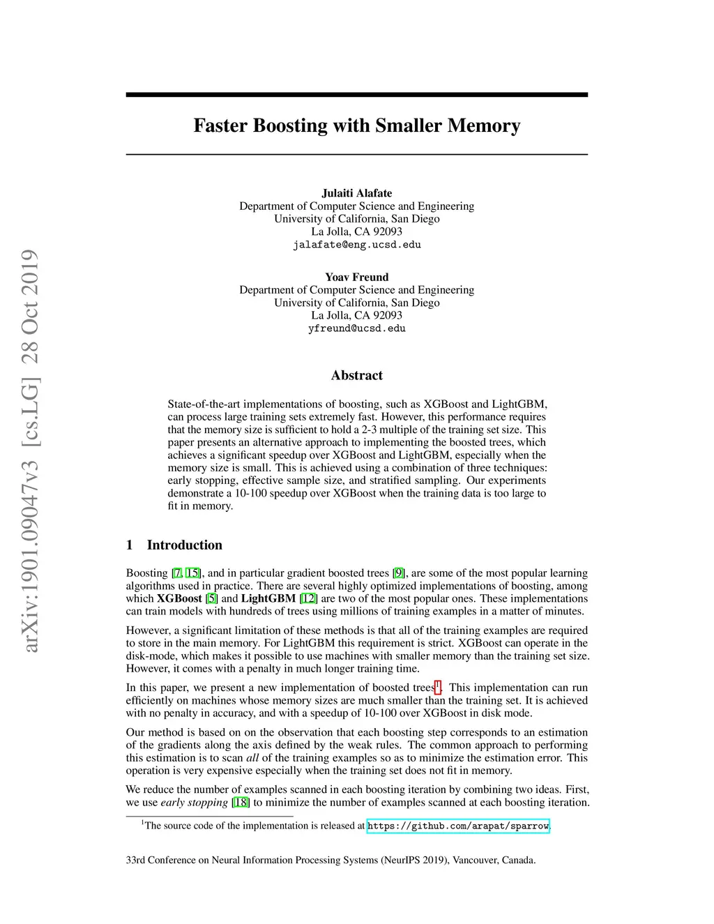 State-of-the-art implementations of boosting, such as XGBoost and LightGBM, can process large training sets extremely fast. However, this performance requires that the memory size is sufficient to hold a 2-3 multiple of the training set size. This paper presents an alternative approach to implementing the boosted trees, which achieves a significant speedup over XGBoost and LightGBM, especially when the memory size is small. This is achieved using a combination of three techniques: early stopping, effective sample size, and stratified sampling. Our experiments demonstrate a 10-100 speedup over XGBoost when the training data is too large to fit in memory.