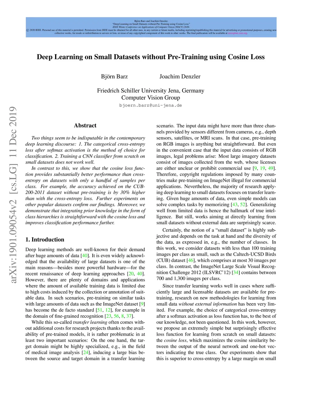 Deep Learning on Small Datasets without Pre-Training using Cosine Loss