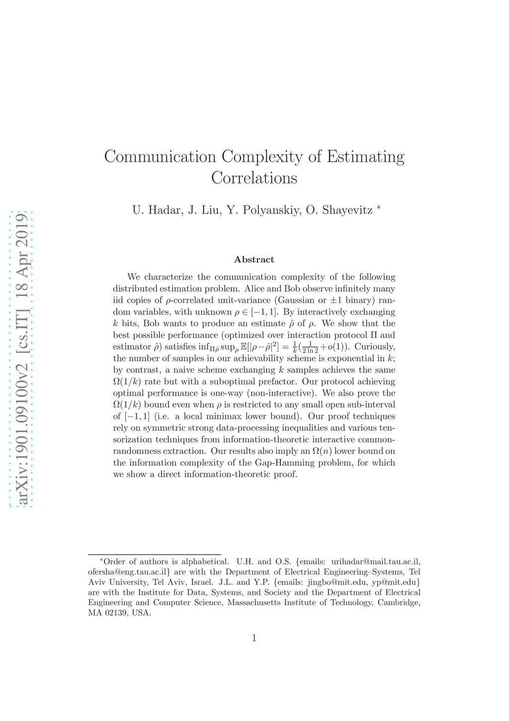 We characterize the communication complexity of the following distributed estimation problem. Alice and Bob observe infinitely many iid copies of -correlated unit-variance (Gaussian or binary) random variables, with unknown . By interactively exchanging bits, Bob wants to produce an estimate of . We show that the best possible performance (optimized over interaction protocol and estimator ) satisfies . Furthermore, we show that the best possible unbiased estimator achieves performance of . Curiously, thus, restricting communication to bits results in (order-wise) similar minimax estimation error as restricting to samples. Our results also imply an lower bound on the information complexity of the Gap-Hamming problem, for which we show a direct information-theoretic proof. Notably, the protocol achieving (almost) optimal performance is one-way (non-interactive). For one-way protocols we also prove the bound even when is restricted to any small open sub-interval of (i.e. a local minimax lower bound). %We do not know if this local behavior remains true in the interactive setting. Our proof techniques rely on symmetric strong data-processing inequalities, various tensorization techniques from information-theoretic interactive common-randomness extraction, and (for the local lower bound) on the Otto-Villani estimate for the Wasserstein-continuity of trajectories of the Ornstein-Uhlenbeck semigroup.