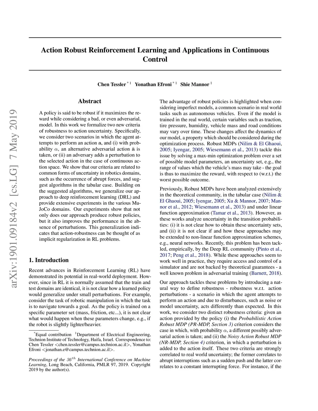 A policy is said to be robust if it maximizes the reward while considering a bad, or even adversarial, model. In this work we formalize two new criteria of robustness to action uncertainty. Specifically, we consider two scenarios in which the agent attempts to perform an action , and (i) with probability , an alternative adversarial action is taken, or (ii) an adversary adds a perturbation to the selected action in the case of continuous action space. We show that our criteria are related to common forms of uncertainty in robotics domains, such as the occurrence of abrupt forces, and suggest algorithms in the tabular case. Building on the suggested algorithms, we generalize our approach to deep reinforcement learning (DRL) and provide extensive experiments in the various MuJoCo domains. Our experiments show that not only does our approach produce robust policies, but it also improves the performance in the absence of perturbations. This generalization indicates that action-robustness can be thought of as implicit regularization in RL problems.