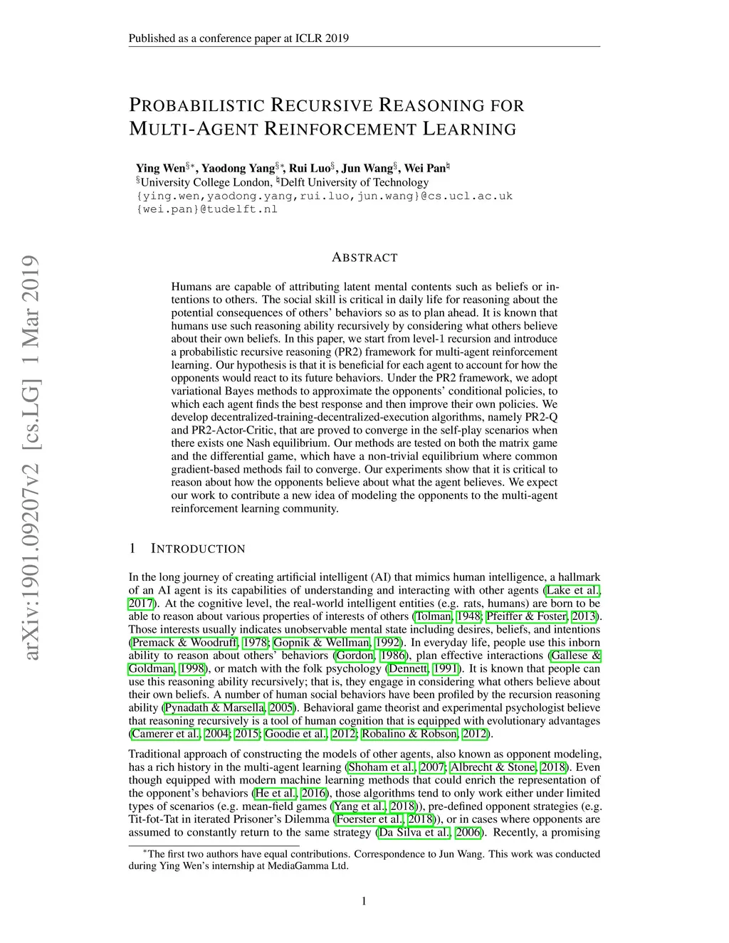 Humans are capable of attributing latent mental contents such as beliefs or intentions to others. The social skill is critical in daily life for reasoning about the potential consequences of others' behaviors so as to plan ahead. It is known that humans use such reasoning ability recursively by considering what others believe about their own beliefs. In this paper, we start from level- recursion and introduce a probabilistic recursive reasoning (PR2) framework for multi-agent reinforcement learning. Our hypothesis is that it is beneficial for each agent to account for how the opponents would react to its future behaviors. Under the PR2 framework, we adopt variational Bayes methods to approximate the opponents' conditional policies, to which each agent finds the best response and then improve their own policies. We develop decentralized-training-decentralized-execution algorithms, namely PR2-Q and PR2-Actor-Critic, that are proved to converge in the self-play scenarios when there exists one Nash equilibrium. Our methods are tested on both the matrix game and the differential game, which have a non-trivial equilibrium where common gradient-based methods fail to converge. Our experiments show that it is critical to reason about how the opponents believe about what the agent believes. We expect our work to contribute a new idea of modeling the opponents to the multi-agent reinforcement learning community.