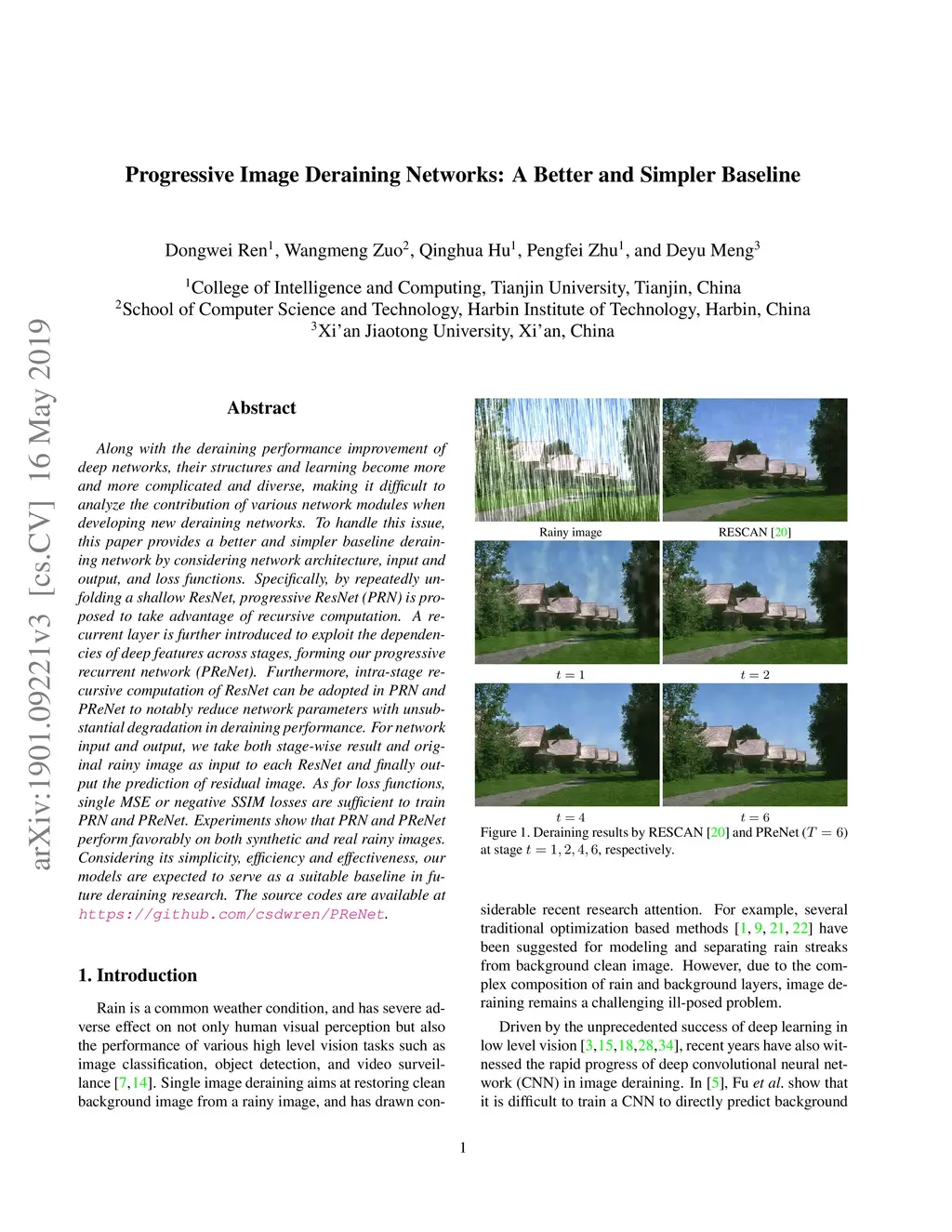 Along with the deraining performance improvement of deep networks, their structures and learning become more and more complicated and diverse, making it difficult to analyze the contribution of various network modules when developing new deraining networks. To handle this issue, this paper provides a better and simpler baseline deraining network by considering network architecture, input and output, and loss functions. Specifically, by repeatedly unfolding a shallow ResNet, progressive ResNet (PRN) is proposed to take advantage of recursive computation. A recurrent layer is further introduced to exploit the dependencies of deep features across stages, forming our progressive recurrent network (PReNet). Furthermore, intra-stage recursive computation of ResNet can be adopted in PRN and PReNet to notably reduce network parameters with graceful degradation in deraining performance. For network input and output, we take both stage-wise result and original rainy image as input to each ResNet and finally output the prediction of {residual image}. As for loss functions, single MSE or negative SSIM losses are sufficient to train PRN and PReNet. Experiments show that PRN and PReNet perform favorably on both synthetic and real rainy images. Considering its simplicity, efficiency and effectiveness, our models are expected to serve as a suitable baseline in future deraining research. The source codes are available at https://github.com/csdwren/PReNet.