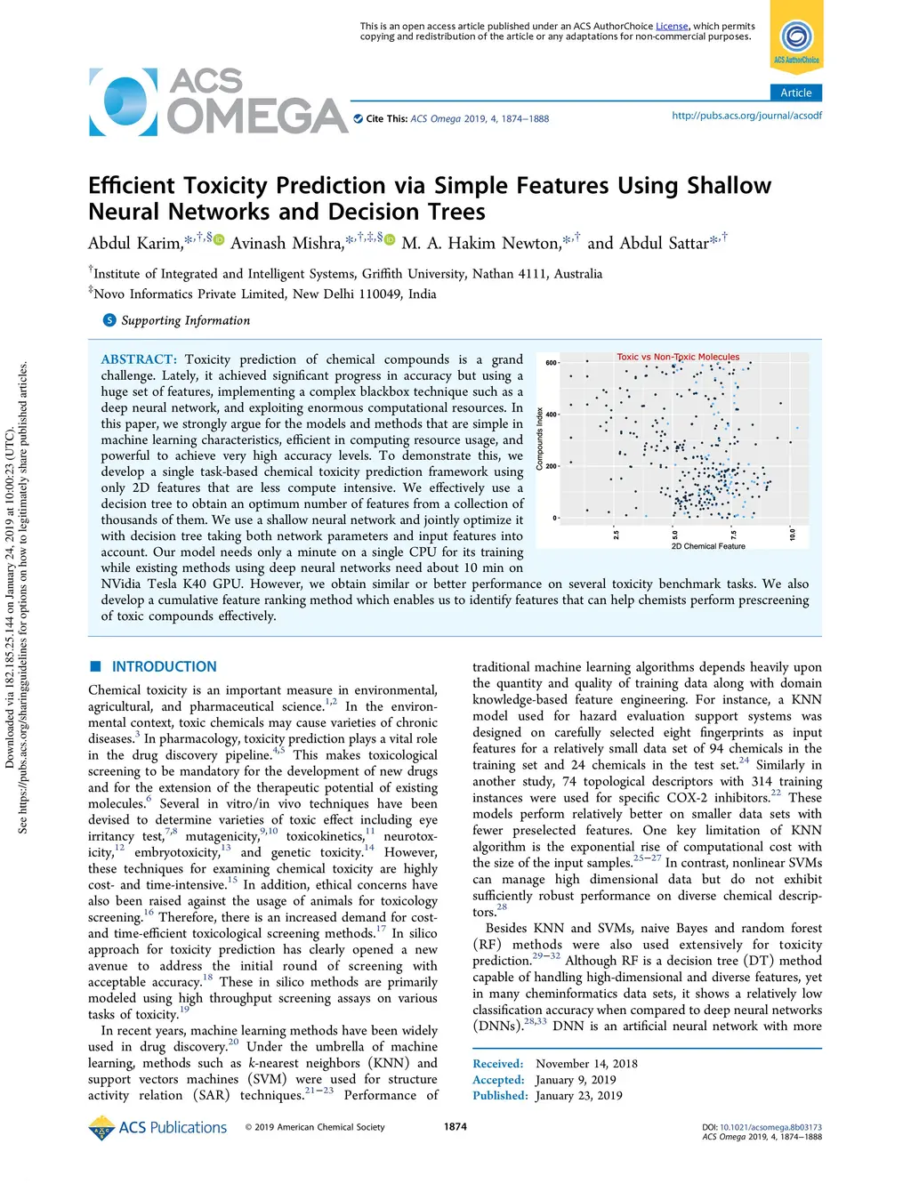 Toxicity prediction of chemical compounds is a grand challenge. Lately, it achieved significant progress in accuracy but using a huge set of features, implementing a complex blackbox technique such as a deep neural network, and exploiting enormous computational resources. In this paper, we strongly argue for the models and methods that are simple in machine learning characteristics, efficient in computing resource usage, and powerful to achieve very high accuracy levels. To demonstrate this, we develop a single task-based chemical toxicity prediction framework using only 2D features that are less compute intensive. We effectively use a decision tree to obtain an optimum number of features from a collection of thousands of them. We use a shallow neural network and jointly optimize it with decision tree taking both network parameters and input features into account. Our model needs only a minute on a single CPU for its training while existing methods using deep neural networks need about 10 min on NVidia Tesla K40 GPU. However, we obtain similar or better performance on several toxicity benchmark tasks. We also develop a cumulative feature ranking method which enables us to identify features that can help chemists perform prescreening of toxic compounds effectively.