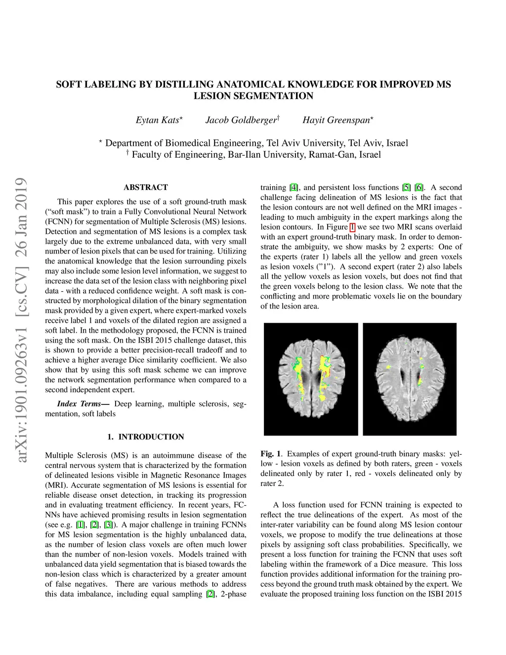 This paper explores the use of a soft ground-truth mask ("soft mask'') to train a Fully Convolutional Neural Network (FCNN) for segmentation of Multiple Sclerosis (MS) lesions. Detection and segmentation of MS lesions is a complex task largely due to the extreme unbalanced data, with very small number of lesion pixels that can be used for training. Utilizing the anatomical knowledge that the lesion surrounding pixels may also include some lesion level information, we suggest to increase the data set of the lesion class with neighboring pixel data - with a reduced confidence weight. A soft mask is constructed by morphological dilation of the binary segmentation mask provided by a given expert, where expert-marked voxels receive label 1 and voxels of the dilated region are assigned a soft label. In the methodology proposed, the FCNN is trained using the soft mask. On the ISBI 2015 challenge dataset, this is shown to provide a better precision-recall tradeoff and to achieve a higher average Dice similarity coefficient. We also show that by using this soft mask scheme we can improve the network segmentation performance when compared to a second independent expert.