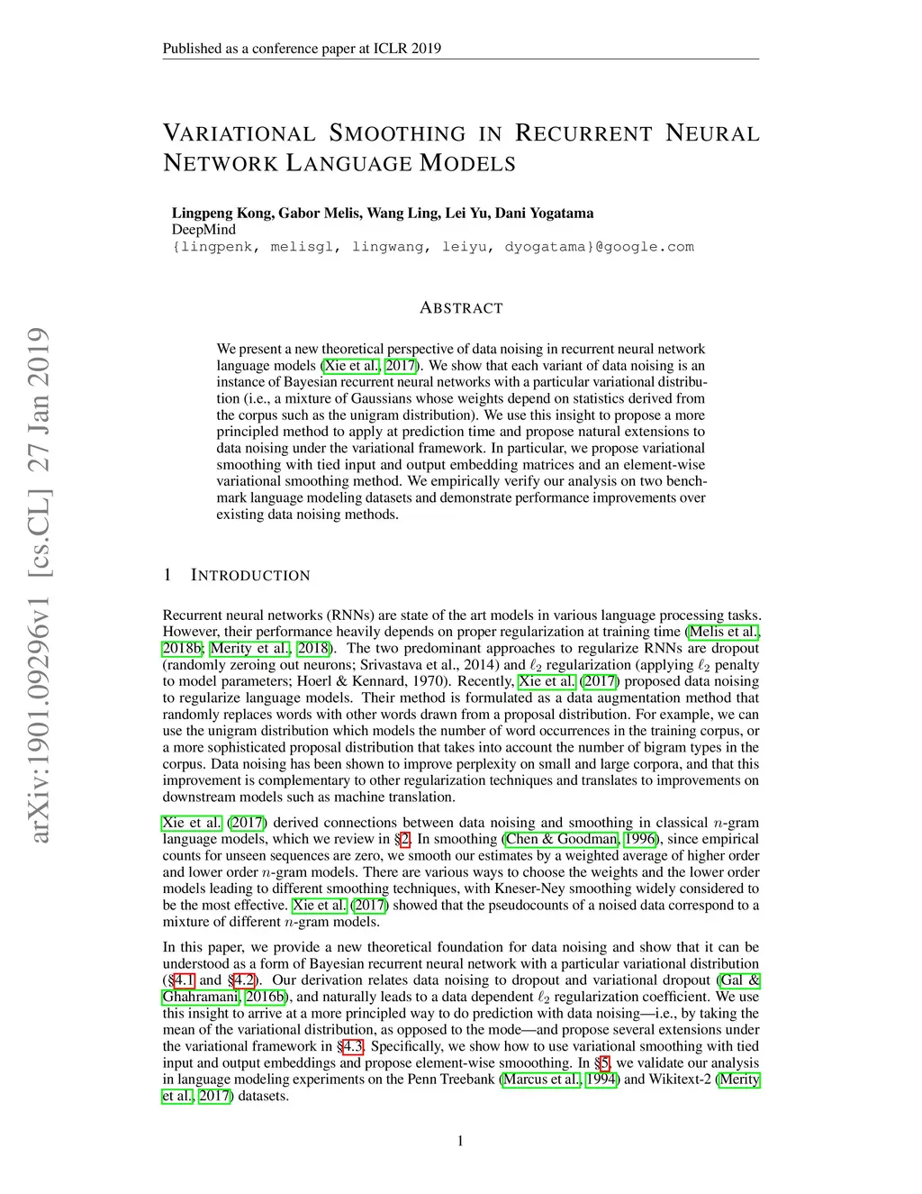 We present a new theoretical perspective of data noising in recurrent neural network language models (Xie et al., 2017). We show that each variant of data noising is an instance of Bayesian recurrent neural networks with a particular variational distribution (i.e., a mixture of Gaussians whose weights depend on statistics derived from the corpus such as the unigram distribution). We use this insight to propose a more principled method to apply at prediction time and propose natural extensions to data noising under the variational framework. In particular, we propose variational smoothing with tied input and output embedding matrices and an element-wise variational smoothing method. We empirically verify our analysis on two benchmark language modeling datasets and demonstrate performance improvements over existing data noising methods.