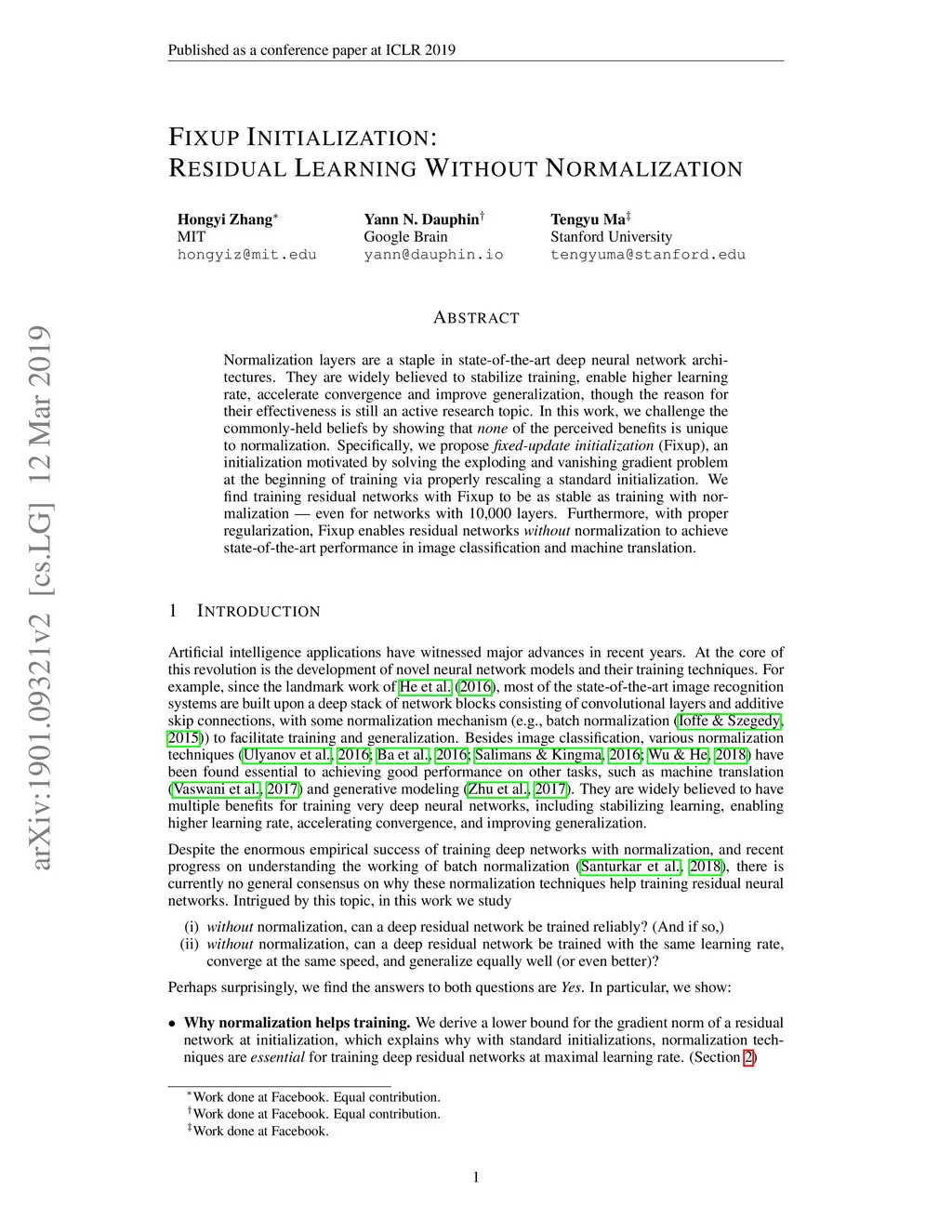 Normalization layers are a staple in state-of-the-art deep neural network architectures. They are widely believed to stabilize training, enable higher learning rate, accelerate convergence and improve generalization, though the reason for their effectiveness is still an active research topic. In this work, we challenge the commonly-held beliefs by showing that none of the perceived benefits is unique to normalization. Specifically, we propose fixed-update initialization (Fixup), an initialization motivated by solving the exploding and vanishing gradient problem at the beginning of training via properly rescaling a standard initialization. We find training residual networks with Fixup to be as stable as training with normalization -- even for networks with 10,000 layers. Furthermore, with proper regularization, Fixup enables residual networks without normalization to achieve state-of-the-art performance in image classification and machine translation.