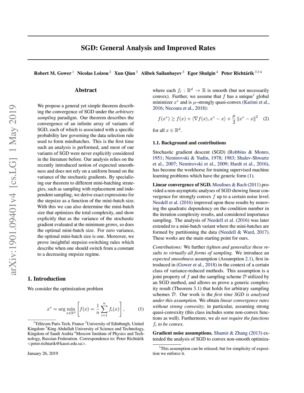 We propose a general yet simple theorem describing the convergence of SGD under the arbitrary sampling paradigm. Our theorem describes the convergence of an infinite array of variants of SGD, each of which is associated with a specific probability law governing the data selection rule used to form mini-batches. This is the first time such an analysis is performed, and most of our variants of SGD were never explicitly considered in the literature before. Our analysis relies on the recently introduced notion of expected smoothness and does not rely on a uniform bound on the variance of the stochastic gradients. By specializing our theorem to different mini-batching strategies, such as sampling with replacement and independent sampling, we derive exact expressions for the stepsize as a function of the mini-batch size. With this we can also determine the mini-batch size that optimizes the total complexity, and show explicitly that as the variance of the stochastic gradient evaluated at the minimum grows, so does the optimal mini-batch size. For zero variance, the optimal mini-batch size is one. Moreover, we prove insightful stepsize-switching rules which describe when one should switch from a constant to a decreasing stepsize regime.