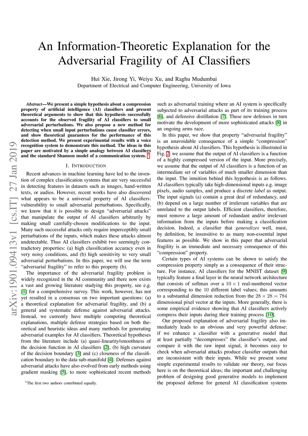 We present a simple hypothesis about a compression property of artificial intelligence (AI) classifiers and present theoretical arguments to show that this hypothesis successfully accounts for the observed fragility of AI classifiers to small adversarial perturbations. We also propose a new method for detecting when small input perturbations cause classifier errors, and show theoretical guarantees for the performance of this detection method. We present experimental results with a voice recognition system to demonstrate this method. The ideas in this paper are motivated by a simple analogy between AI classifiers and the standard Shannon model of a communication system.
