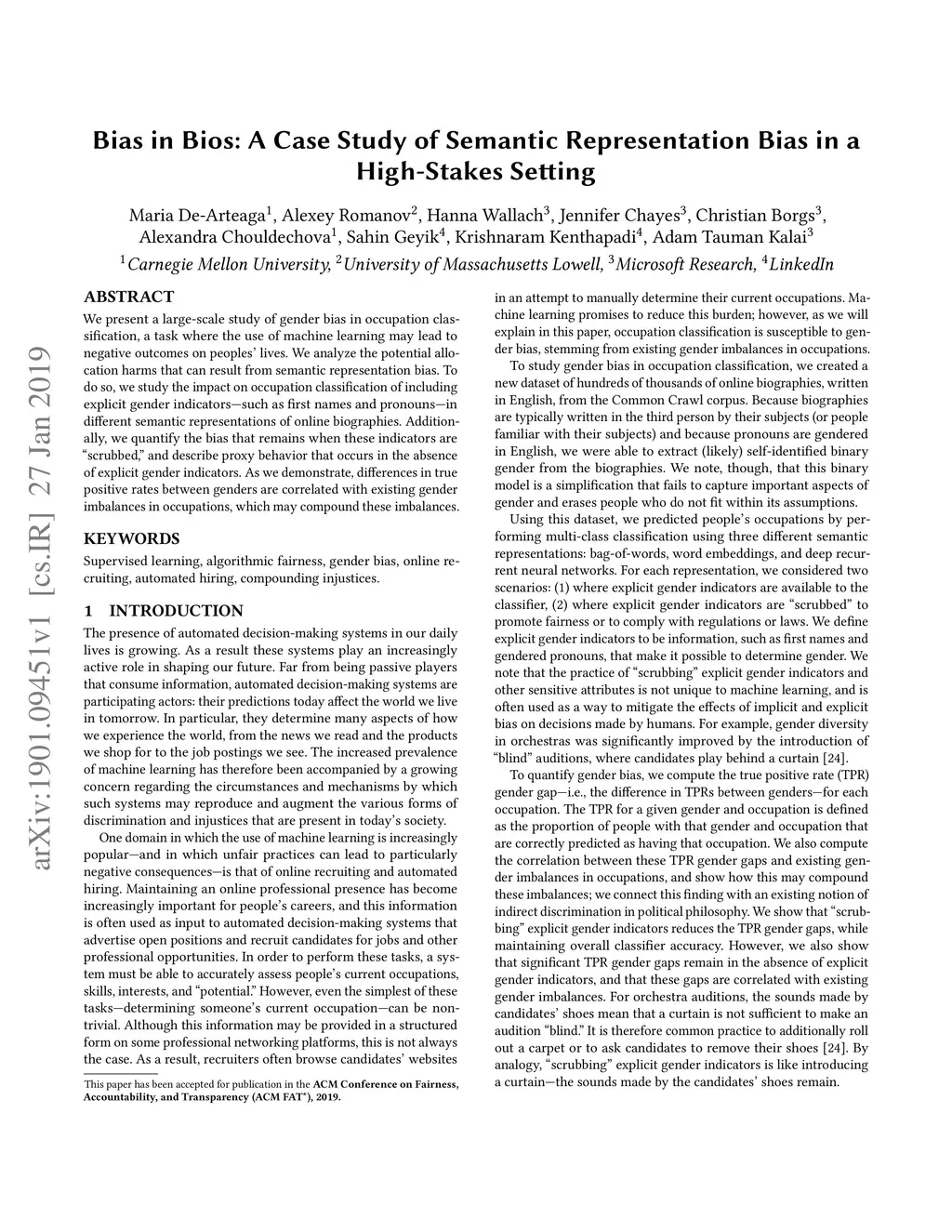 Bias in Bios: A Case Study of Semantic Representation Bias in a