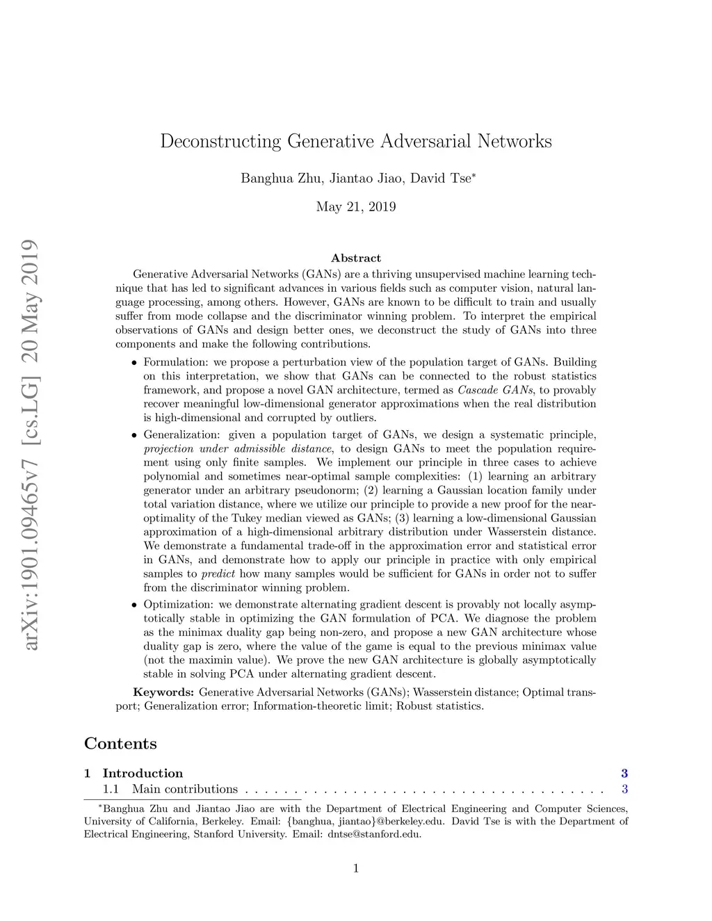 We deconstruct the performance of GANs into three components: 1. Formulation: we propose a perturbation view of the population target of GANs. Building on this interpretation, we show that GANs can be viewed as a generalization of the robust statistics framework, and propose a novel GAN architecture, termed as Cascade GANs, to provably recover meaningful low-dimensional generator approximations when the real distribution is high-dimensional and corrupted by outliers. 2. Generalization: given a population target of GANs, we design a systematic principle, projection under admissible distance, to design GANs to meet the population requirement using finite samples. We implement our principle in three cases to achieve polynomial and sometimes near-optimal sample complexities: (1) learning an arbitrary generator under an arbitrary pseudonorm; (2) learning a Gaussian location family under TV distance, where we utilize our principle provide a new proof for the optimality of Tukey median viewed as GANs; (3) learning a low-dimensional Gaussian approximation of a high-dimensional arbitrary distribution under Wasserstein distance. We demonstrate a fundamental trade-off in the approximation error and statistical error in GANs, and show how to apply our principle with empirical samples to predict how many samples are sufficient for GANs in order not to suffer from the discriminator winning problem. 3. Optimization: we demonstrate alternating gradient descent is provably not locally asymptotically stable in optimizing the GAN formulation of PCA. We diagnose the problem as the minimax duality gap being non-zero, and propose a new GAN architecture whose duality gap is zero, where the value of the game is equal to the previous minimax value (not the maximin value). We prove the new GAN architecture is globally asymptotically stable in optimization under alternating gradient descent.