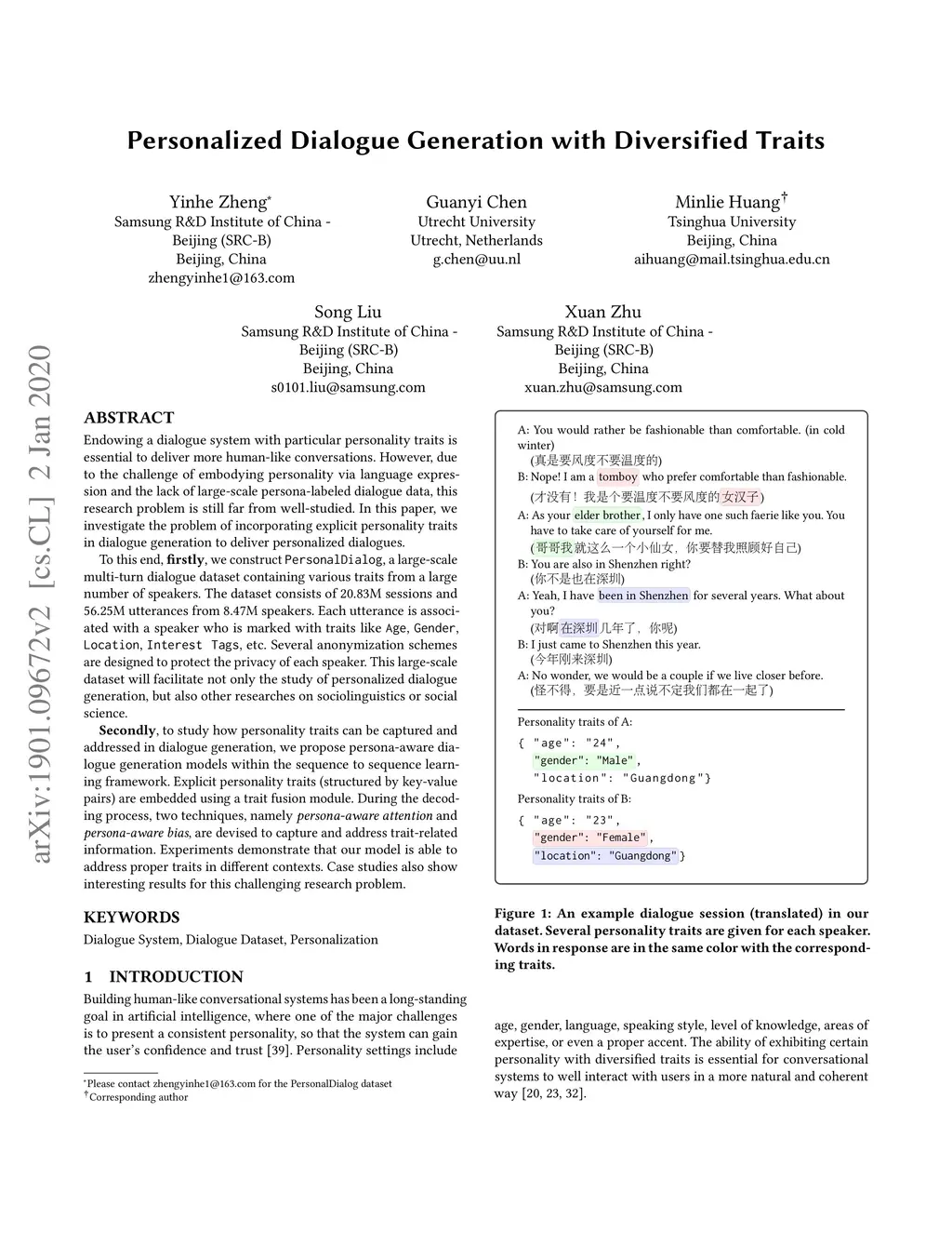 Endowing a dialogue system with particular personality traits is essential to deliver more human-like conversations. However, due to the challenge of embodying personality via language expression and the lack of large-scale persona-labeled dialogue data, this research problem is still far from well-studied. In this paper, we investigate the problem of incorporating explicit personality traits in dialogue generation to deliver personalized dialogues. To this end, firstly, we construct PersonalDialog, a large-scale multi-turn dialogue dataset containing various traits from a large number of speakers. The dataset consists of 20.83M sessions and 56.25M utterances from 8.47M speakers. Each utterance is associated with a speaker who is marked with traits like Age, Gender, Location, Interest Tags, etc. Several anonymization schemes are designed to protect the privacy of each speaker. This large-scale dataset will facilitate not only the study of personalized dialogue generation, but also other researches on sociolinguistics or social science. Secondly, to study how personality traits can be captured and addressed in dialogue generation, we propose persona-aware dialogue generation models within the sequence to sequence learning framework. Explicit personality traits (structured by key-value pairs) are embedded using a trait fusion module. During the decoding process, two techniques, namely persona-aware attention and persona-aware bias, are devised to capture and address trait-related information. Experiments demonstrate that our model is able to address proper traits in different contexts. Case studies also show interesting results for this challenging research problem.