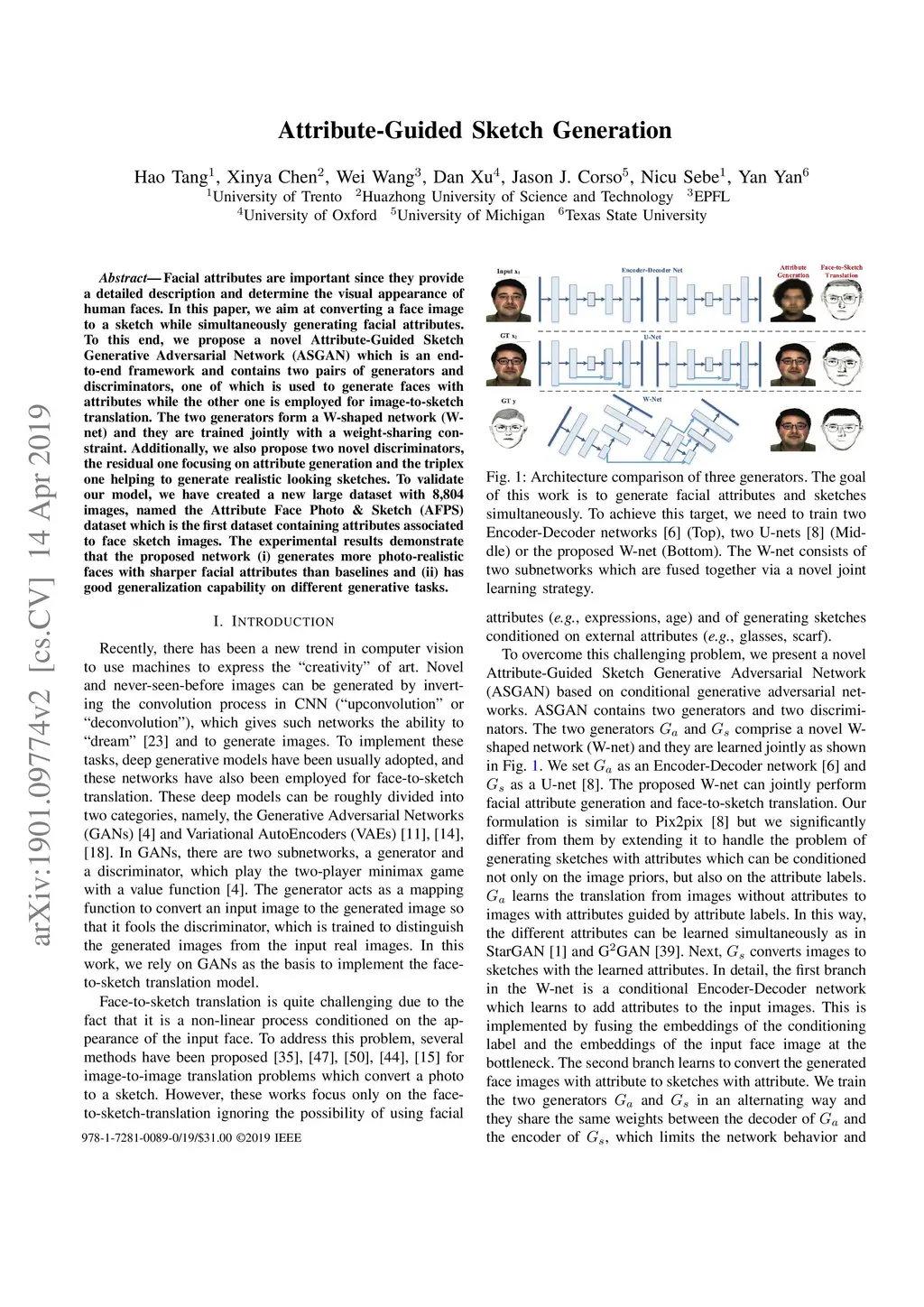 Facial attributes are important since they provide a detailed description and determine the visual appearance of human faces. In this paper, we aim at converting a face image to a sketch while simultaneously generating facial attributes. To this end, we propose a novel Attribute-Guided Sketch Generative Adversarial Network (ASGAN) which is an end-to-end framework and contains two pairs of generators and discriminators, one of which is used to generate faces with attributes while the other one is employed for image-to-sketch translation. The two generators form a W-shaped network (W-net) and they are trained jointly with a weight-sharing constraint. Additionally, we also propose two novel discriminators, the residual one focusing on attribute generation and the triplex one helping to generate realistic looking sketches. To validate our model, we have created a new large dataset with 8,804 images, named the Attribute Face Photo & Sketch (AFPS) dataset which is the first dataset containing attributes associated to face sketch images. The experimental results demonstrate that the proposed network (i) generates more photo-realistic faces with sharper facial attributes than baselines and (ii) has good generalization capability on different generative tasks.