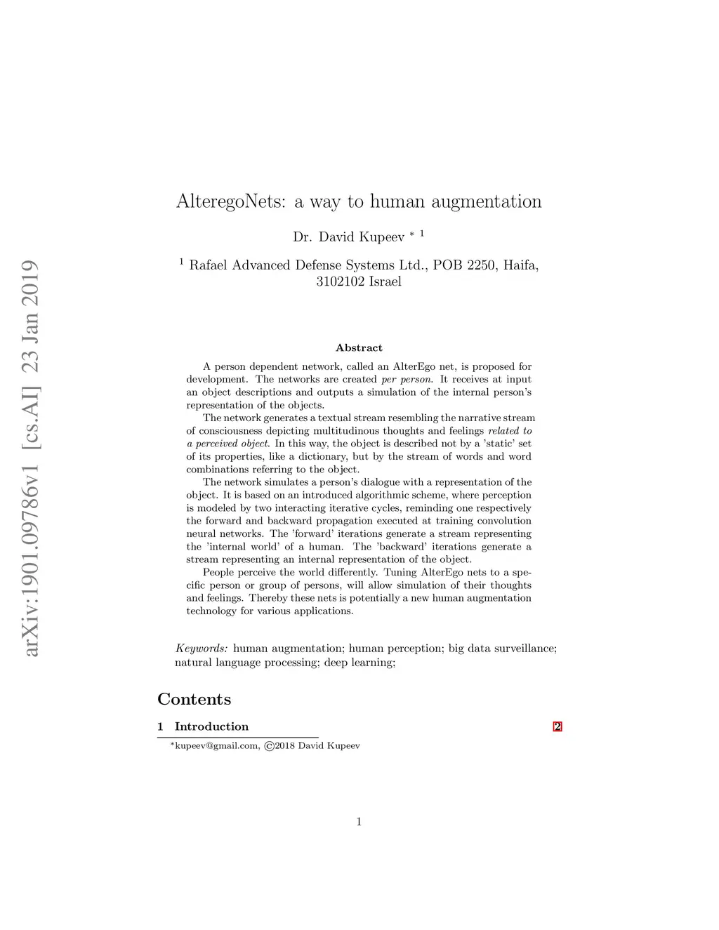 A person dependent network, called an AlterEgo net, is proposed for development. The networks are created per person. It receives at input an object descriptions and outputs a simulation of the internal person's representation of the objects. The network generates a textual stream resembling the narrative stream of consciousness depicting multitudinous thoughts and feelings related to a perceived object. In this way, the object is described not by a 'static' set of its properties, like a dictionary, but by the stream of words and word combinations referring to the object. The network simulates a person's dialogue with a representation of the object. It is based on an introduced algorithmic scheme, where perception is modeled by two interacting iterative cycles, reminding one respectively the forward and backward propagation executed at training convolution neural networks. The 'forward' iterations generate a stream representing the ínternal world' of a human. The 'backward' iterations generate a stream representing an internal representation of the object. People perceive the world differently. Tuning AlterEgo nets to a specific person or group of persons, will allow simulation of their thoughts and feelings. Thereby these nets is potentially a new human augmentation technology for various applications.