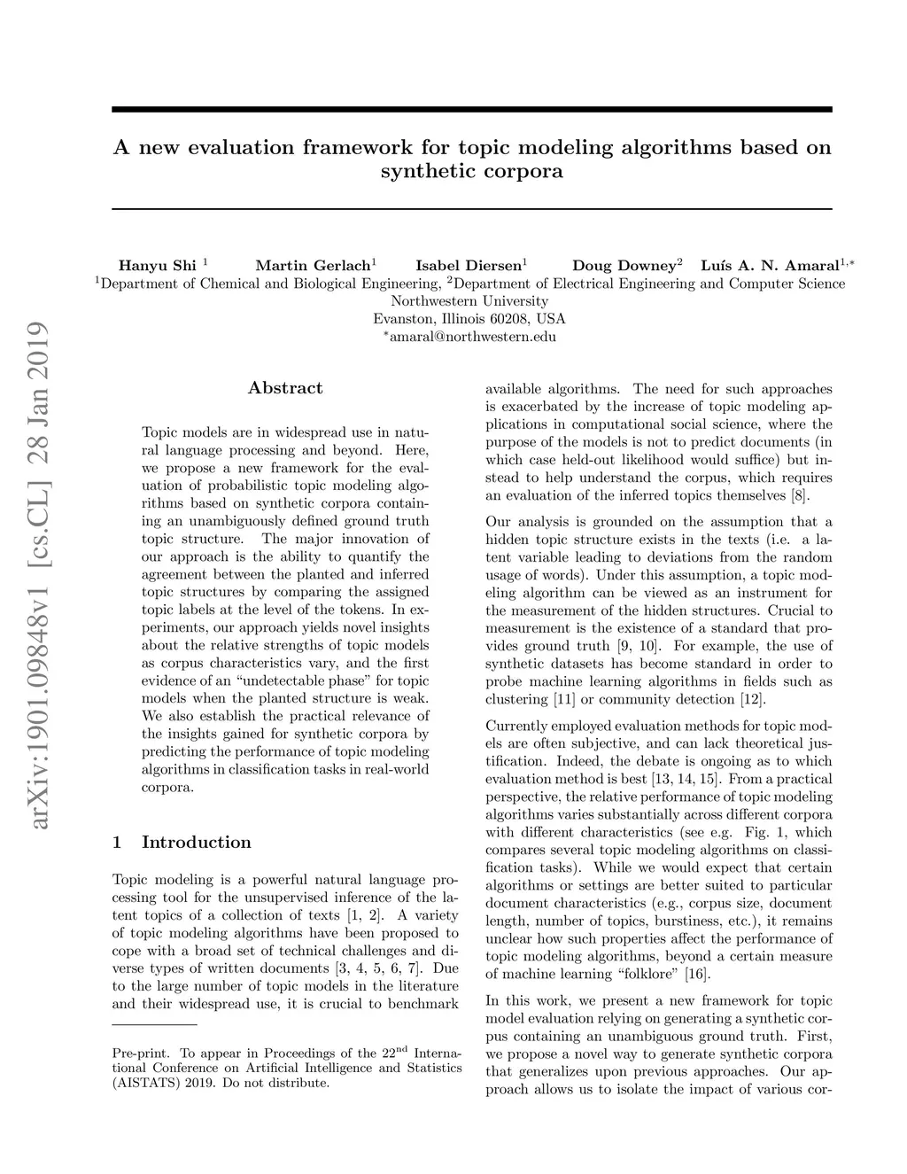 Topic models are in widespread use in natural language processing and beyond. Here, we propose a new framework for the evaluation of probabilistic topic modeling algorithms based on synthetic corpora containing an unambiguously defined ground truth topic structure. The major innovation of our approach is the ability to quantify the agreement between the planted and inferred topic structures by comparing the assigned topic labels at the level of the tokens. In experiments, our approach yields novel insights about the relative strengths of topic models as corpus characteristics vary, and the first evidence of an "undetectable phase" for topic models when the planted structure is weak. We also establish the practical relevance of the insights gained for synthetic corpora by predicting the performance of topic modeling algorithms in classification tasks in real-world corpora.