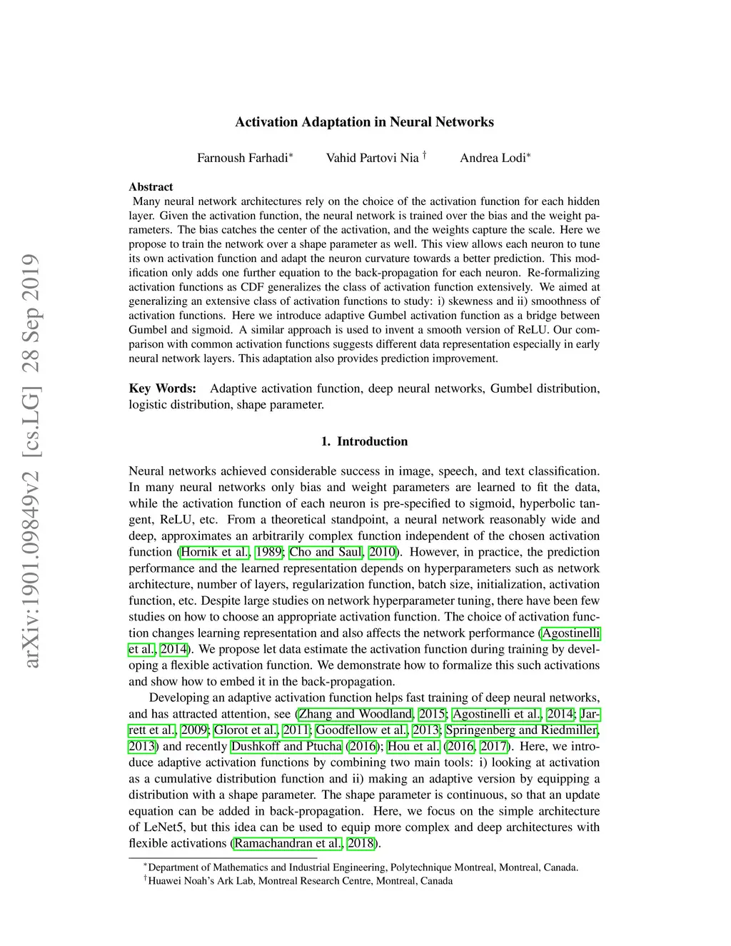 Many neural network architectures rely on the choice of the activation function for each hidden layer. Given the activation function, the neural network is trained over the bias and the weight parameters. The bias catches the center of the activation, and the weights capture the scale. Here we propose to train the network over a shape parameter as well. This view allows each neuron to tune its own activation function and adapt the neuron curvature towards a better prediction. This modification only adds one further equation to the back-propagation for each neuron. Re-formalizing activation functions as CDF generalizes the class of activation function extensively. We aimed at generalizing an extensive class of activation functions to study: i) skewness and ii) smoothness of activation functions. Here we introduce adaptive Gumbel activation function as a bridge between Gumbel and sigmoid. A similar approach is used to invent a smooth version of ReLU. Our comparison with common activation functions suggests different data representation especially in early neural network layers. This adaptation also provides prediction improvement.