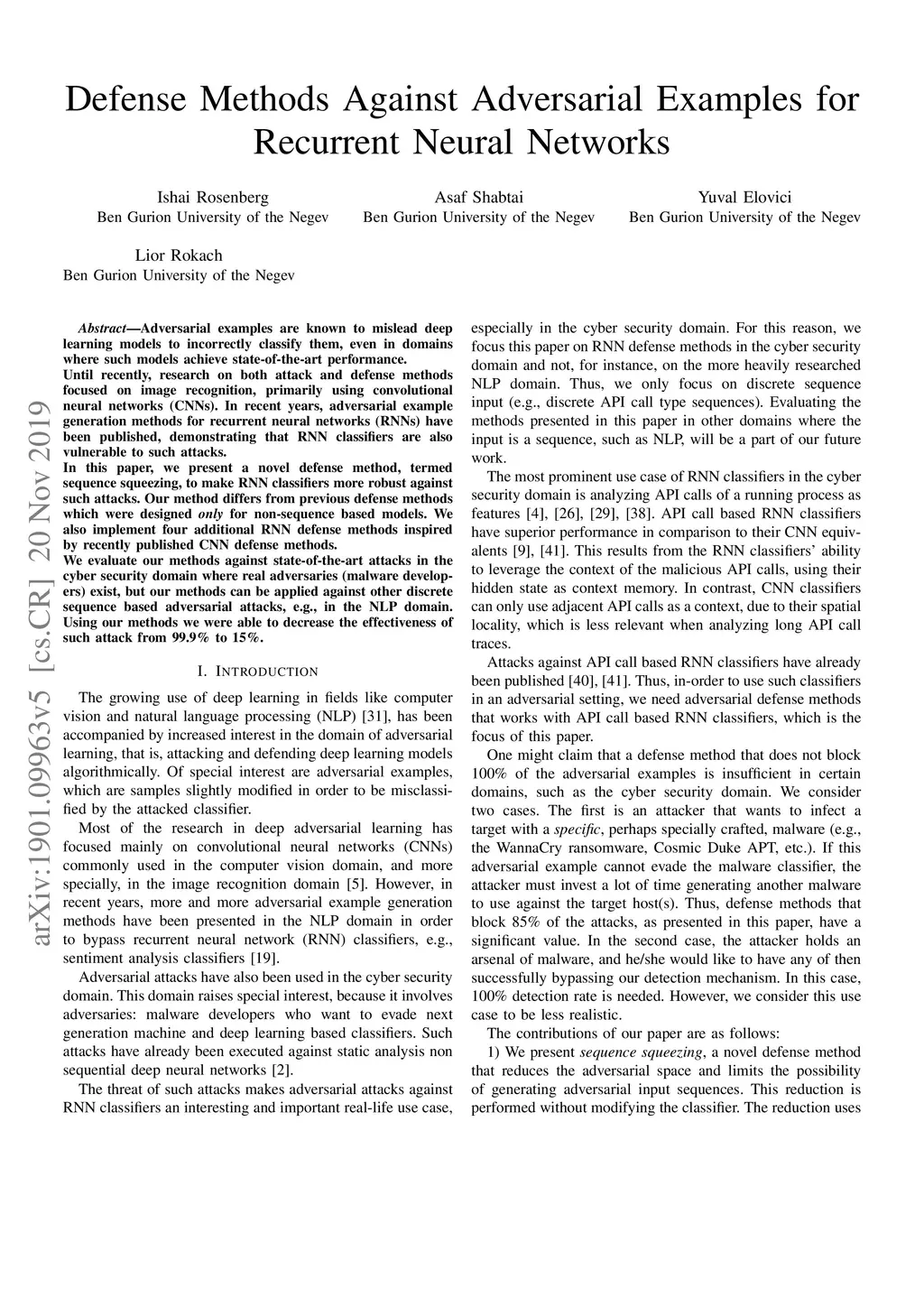 Adversarial examples are known to mislead deep learning models to incorrectly classify them, even in domains where such models achieve state-of-the-art performance. Until recently, research on both attack and defense methods focused on image recognition, primarily using convolutional neural networks (CNNs). In recent years, adversarial example generation methods for recurrent neural networks (RNNs) have been published, demonstrating that RNN classifiers are also vulnerable to such attacks. In this paper, we present a novel defense method, termed sequence squeezing, to make RNN classifiers more robust against such attacks. Our method differs from previous defense methods which were designed only for non-sequence based models. We also implement four additional RNN defense methods inspired by recently published CNN defense methods. We evaluate our methods against state-of-the-art attacks in the cyber security domain where real adversaries (malware developers) exist, but our methods can be applied against other discrete sequence based adversarial attacks, e.g., in the NLP domain. Using our methods we were able to decrease the effectiveness of such attack from 99.9% to 15%.