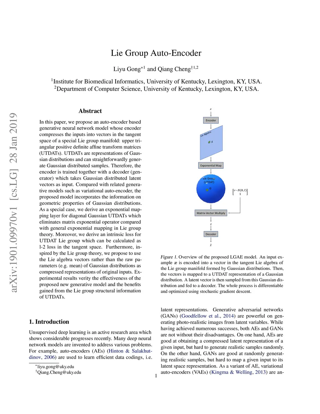 In this paper, we propose an auto-encoder based generative neural network model whose encoder compresses the inputs into vectors in the tangent space of a special Lie group manifold: upper triangular positive definite affine transform matrices (UTDATs). UTDATs are representations of Gaussian distributions and can straightforwardly generate Gaussian distributed samples. Therefore, the encoder is trained together with a decoder (generator) which takes Gaussian distributed latent vectors as input. Compared with related generative models such as variational auto-encoder, the proposed model incorporates the information on geometric properties of Gaussian distributions. As a special case, we derive an exponential mapping layer for diagonal Gaussian UTDATs which eliminates matrix exponential operator compared with general exponential mapping in Lie group theory. Moreover, we derive an intrinsic loss for UTDAT Lie group which can be calculated as l-2 loss in the tangent space. Furthermore, inspired by the Lie group theory, we propose to use the Lie algebra vectors rather than the raw parameters (e.g. mean) of Gaussian distributions as compressed representations of original inputs. Experimental results verity the effectiveness of the proposed new generative model and the benefits gained from the Lie group structural information of UTDATs.