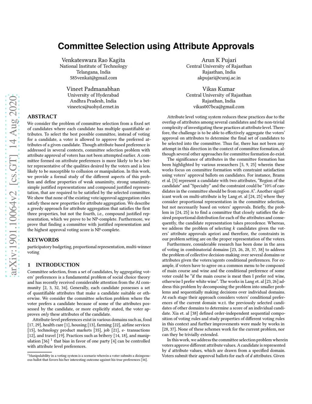 We consider the problem of committee selection from a fixed set of candidates where each candidate has multiple quantifiable attributes. To select the best possible committee, instead of voting for a candidate, a voter is allowed to approve the preferred attributes of a given candidate. Though attribute based preference is addressed in several contexts, committee selection problem with attribute approval of voters has not been attempted earlier. A committee formed on attribute preferences is more likely to be a better representative of the qualities desired by the voters and is less likely to be susceptible to collusion or manipulation. In this work, we provide a formal study of the different aspects of this problem and define properties of weak unanimity, strong unanimity, simple justified representations and compound justified representation, that are required to be satisfied by the selected committee. We show that none of the existing vote/approval aggregation rules satisfy these new properties for attribute aggregation. We describe a greedy approach for attribute aggregation that satisfies the first three properties, but not the fourth, i.e., compound justified representation, which we prove to be NP-complete. Furthermore, we prove that finding a committee with justified representation and the highest approval voting score is NP-complete.