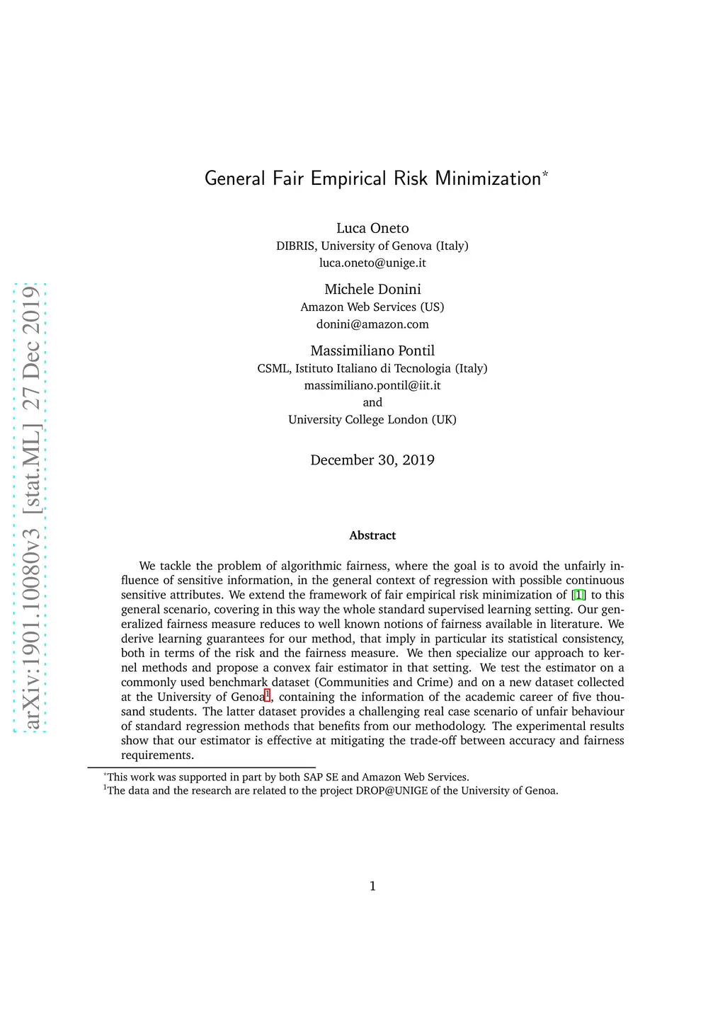 We tackle the problem of algorithmic fairness, where the goal is to avoid the unfairly influence of sensitive information, in the general context of regression with possible continuous sensitive attributes. We extend the framework of fair empirical risk minimization to this general scenario, covering in this way the whole standard supervised learning setting. Our generalized fairness measure reduces to well known notions of fairness available in literature. We derive learning guarantees for our method, that imply in particular its statistical consistency, both in terms of the risk and the fairness measure. We then specialize our approach to kernel methods and propose a convex fair estimator in that setting. We test the estimator on a commonly used benchmark dataset (Communities and Crime) and on a new dataset collected at the University of Genova, containing the information of the academic career of five thousand students. The latter dataset provides a challenging real case scenario of unfair behaviour of standard regression methods that benefits from our methodology. The experimental results show that our estimator is effective at mitigating the trade-off between accuracy and fairness requirements.