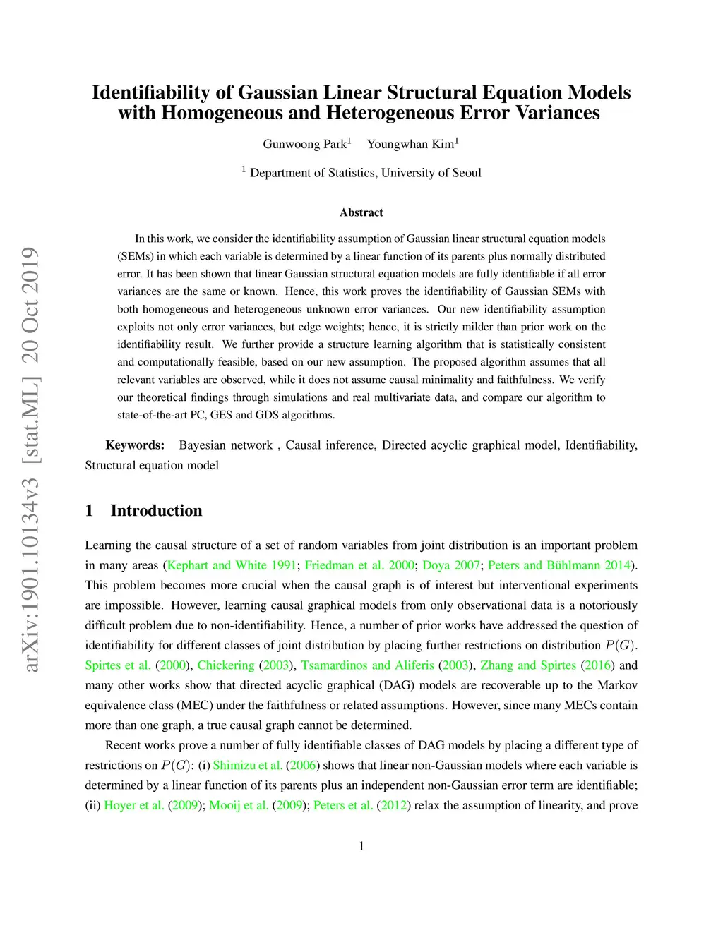 In this work, we consider the identifiability assumption of Gaussian linear structural equation models (SEMs) in which each variable is determined by a linear function of its parents plus normally distributed error. It has been shown that linear Gaussian structural equation models are fully identifiable if all error variances are the same or known. Hence, this work proves the identifiability of Gaussian SEMs with both homogeneous and heterogeneous unknown error variances. Our new identifiability assumption exploits not only error variances, but edge weights; hence, it is strictly milder than prior work on the identifiability result. We further provide a structure learning algorithm that is statistically consistent and computationally feasible, based on our new assumption. The proposed algorithm assumes that all relevant variables are observed, while it does not assume causal minimality and faithfulness. We verify our theoretical findings through simulations and real multivariate data, and compare our algorithm to state-of-the-art PC, GES and GDS algorithms.