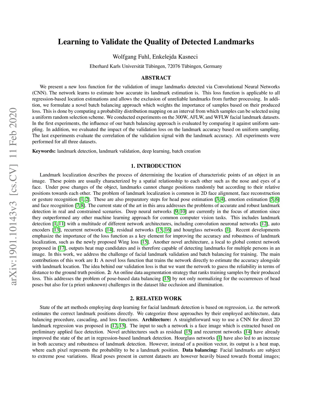 We present a new loss function for the validation of image landmarks detected via Convolutional Neural Networks (CNN). The network learns to estimate how accurate its landmark estimation is. This loss function is applicable to all regression-based location estimations and allows the exclusion of unreliable landmarks from further processing. In addition, we formulate a novel batch balancing approach which weights the importance of samples based on their produced loss. This is done by computing a probability distribution mapping on an interval from which samples can be selected using a uniform random selection scheme. We conducted experiments on the 300W, AFLW, and WFLW facial landmark datasets. In the first experiments, the influence of our batch balancing approach is evaluated by comparing it against uniform sampling. In addition, we evaluated the impact of the validation loss on the landmark accuracy based on uniform sampling. The last experiments evaluate the correlation of the validation signal with the landmark accuracy. All experiments were performed for all three datasets.