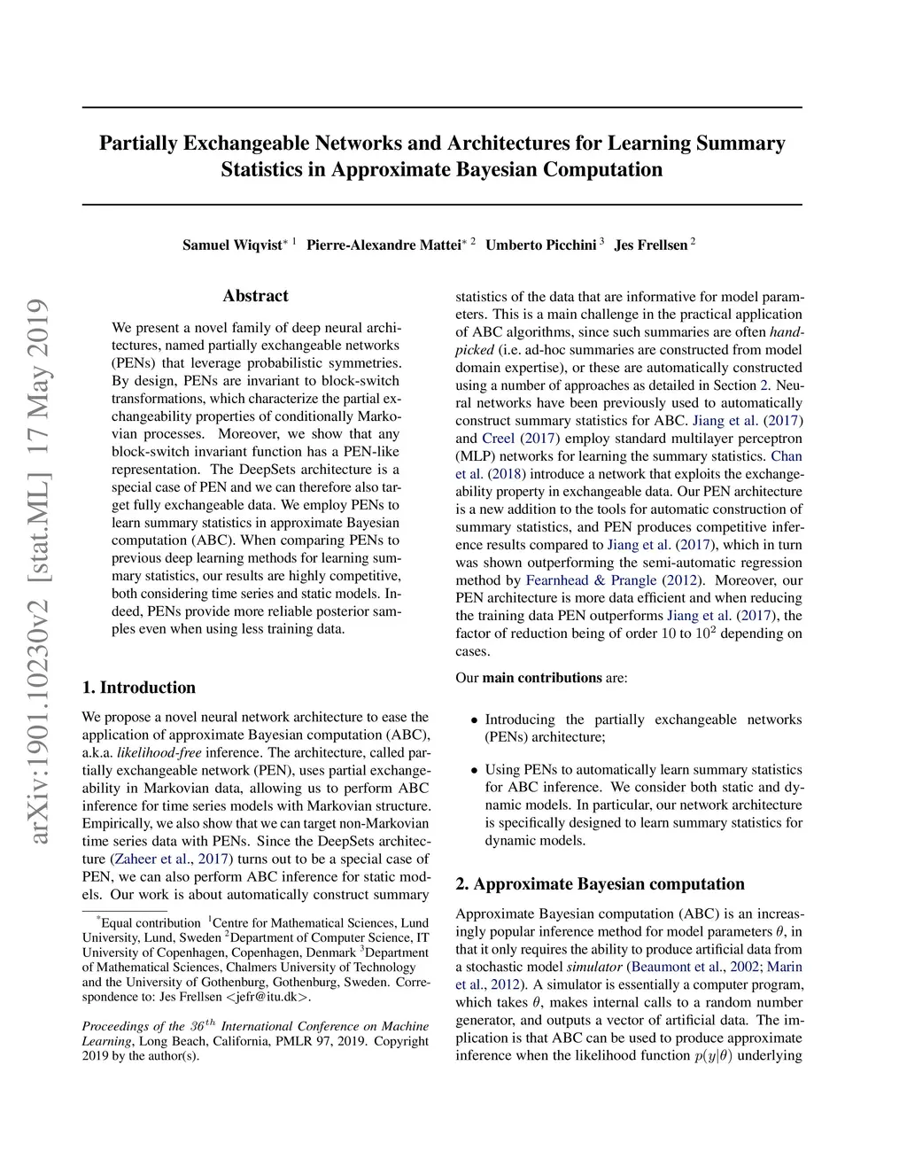 We present a novel family of deep neural architectures, named partially exchangeable networks (PENs) that leverage probabilistic symmetries. By design, PENs are invariant to block-switch transformations, which characterize the partial exchangeability properties of conditionally Markovian processes. Moreover, we show that any block-switch invariant function has a PEN-like representation. The DeepSets architecture is a special case of PEN and we can therefore also target fully exchangeable data. We employ PENs to learn summary statistics in approximate Bayesian computation (ABC). When comparing PENs to previous deep learning methods for learning summary statistics, our results are highly competitive, both considering time series and static models. Indeed, PENs provide more reliable posterior samples even when using less training data.