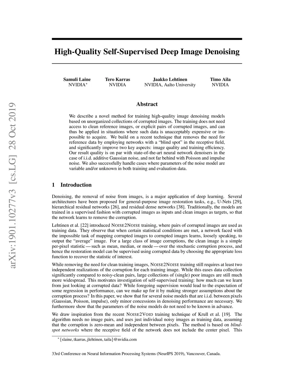 We describe techniques for training high-quality image denoising models that require only single instances of corrupted images as training data. Inspired by a recent technique that removes the need for supervision through image pairs by employing networks with a "blind spot" in the receptive field, we address two of its shortcomings: inefficient training and somewhat disappointing final denoising performance. This is achieved through a novel blind-spot convolutional network architecture that allows efficient self-supervised training, as well as application of Bayesian distribution prediction on output colors. Together, they bring the self-supervised model on par with fully supervised deep learning techniques in terms of both quality and training speed in the case of i.i.d. Gaussian noise.